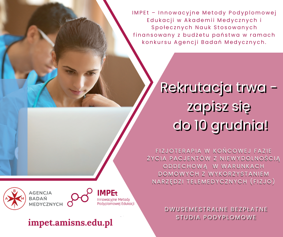 IMPEt – Innowacyjne Metody Podyplomowej Edukacji w Akademii Medycznych i Społecznych Nauk Stosowanych finansowany z budżetu państwa w ramach konkursu Agencji Badań Medycznych.