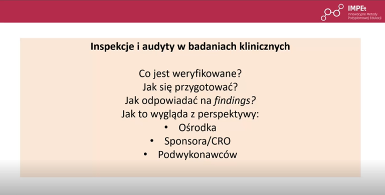 - „Inspekcje i Audyty w badaniach klinicznych w Europie i na świecie – wykład grupa I”, który poprowadziła mgr Agnieszka Pliszka.