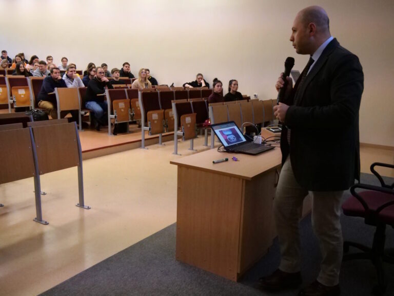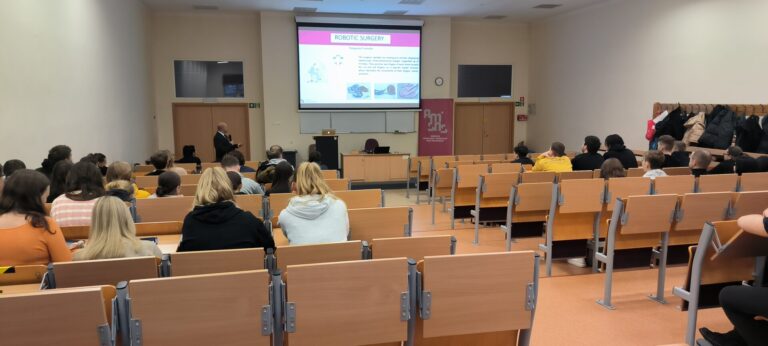 Pan profesor Marano wprowadził zebranych na sali studentów w zagadnienia związane z wykorzystaniem w chirurgii robota DaVinci – urządzenia, na którym sam pracuje. Wykorzystanie takiego rozwiązania pozwala na zredukowanie inwazyjności przeprowadzanego zabiegu oraz, dzięki specjalistycznej budowie urządzenia, zwiększa precyzję wykonywanych ruchów. Podobne możliwości otwiera przed lekarzami zastosowanie noża CyberKnife, którego użycie pozwala na leczenie najtrudniejszych przypadków nowotworów. W zasięgu chirurgów jest również obecnie wykorzystanie druku 3D. To rozwiązanie umożliwia przeprowadzenie symulacyjnej operacji trudnodostępnych miejsc przed wykonaniem operacji na pacjencie, a co za tym idzie, zwiększenie precyzji i zredukowanie czasu operacji. Co istotne, to rozwiązanie umożliwia też pokazanie przebiegu operacji pacjentowi oraz jego rodzinie, co zwiększa poziom zrozumienia procedury oraz ma pozytywny wpływ na komfort zarówno pacjenta jak i jego bliskich.