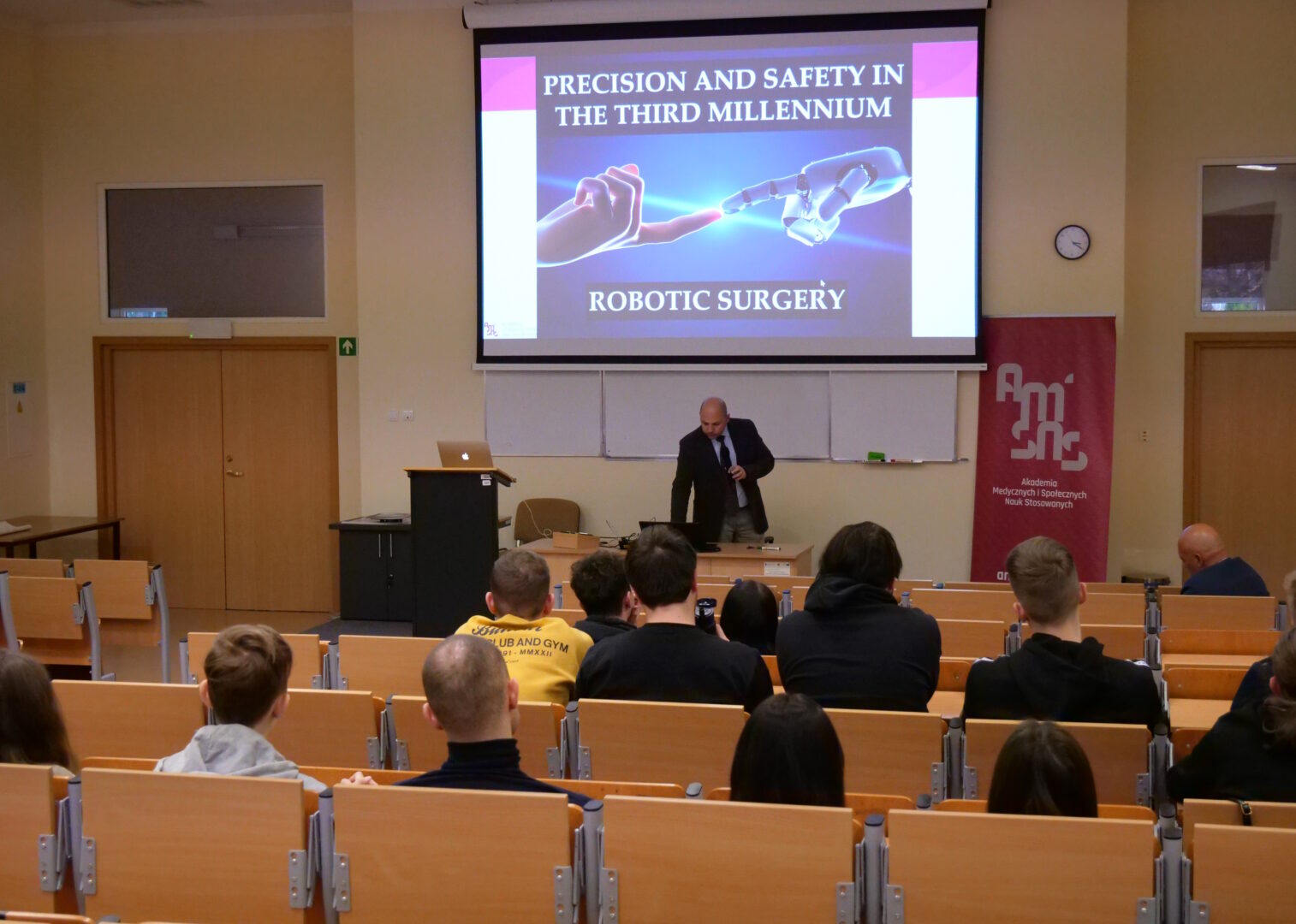 21 listopada 2023 r. studenci Wydziału Lekarskiego AMiSNS wzięli udział w wykładzie prof. Luigi Marano, chirurga onkologa ze Szpitala Uniwersyteckiego w Sienie (Włochy). Pan profesor pełni na uczelni funkcję Pełnomocnika Rektora ds. rozwoju współpracy międzynarodowej w zakresie nauk medycznych. W artykule, który ukazał się na stronie uczelni 23 października 2023, przybliżaliśmy sylwetkę pana Marano jako renomowanego specjalisty w dziedzinie robotyki chirurgicznej.