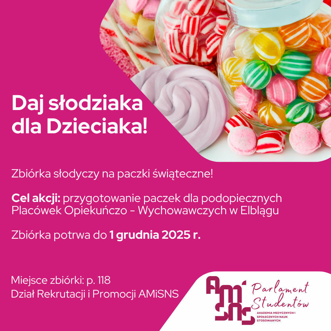 Parlament Studencki, wraz z Wiceprezydentem Magdaleną Lewalską, zaprasza do włączenia się w świąteczną zbiórkę słodyczy organizowaną z myślą o podopiecznych elbląskich placówek szkolno-wychowawczych. Celem akcji jest przekazanie dzieciom symbolicznego upominku, który przyniesie im radość i poczucie wsparcia.