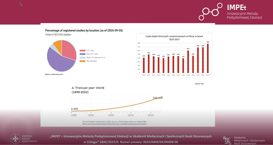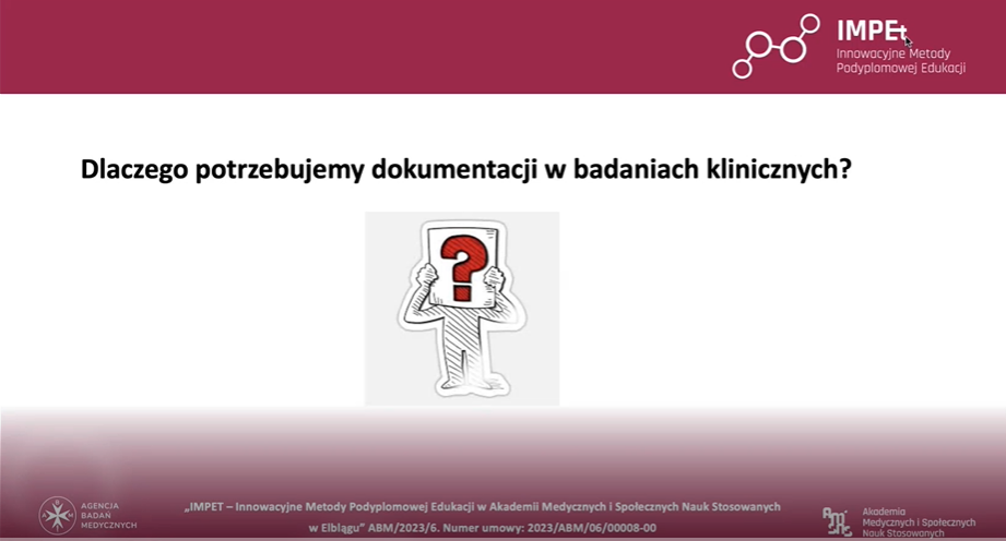 „Główne dokumenty badania klinicznego przed uruchomieniem badania, w trakcie i po jego realizacji”, wykład dr n. med. Marty Bednarek kompleksowo przedstawił dokumentację towarzyszącą badaniu klinicznemu na każdym etapie jego trwania. Omówiono m.in. dokumenty niezbędne do rozpoczęcia badania, wymagania dotyczące ich aktualizacji podczas jego prowadzenia oraz obowiązki związane z finalnym raportowaniem i archiwizacją.