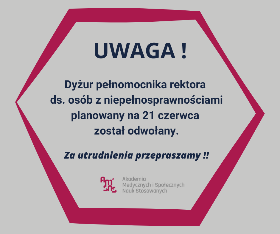 Uprzejmie informujemy, że dyżur pełnomocnika rektora ds. osób z niepełnosprawnościami, który był planowany na 21 czerwca, został odwołany. Przepraszamy za wszelkie niedogodności z tym związane.