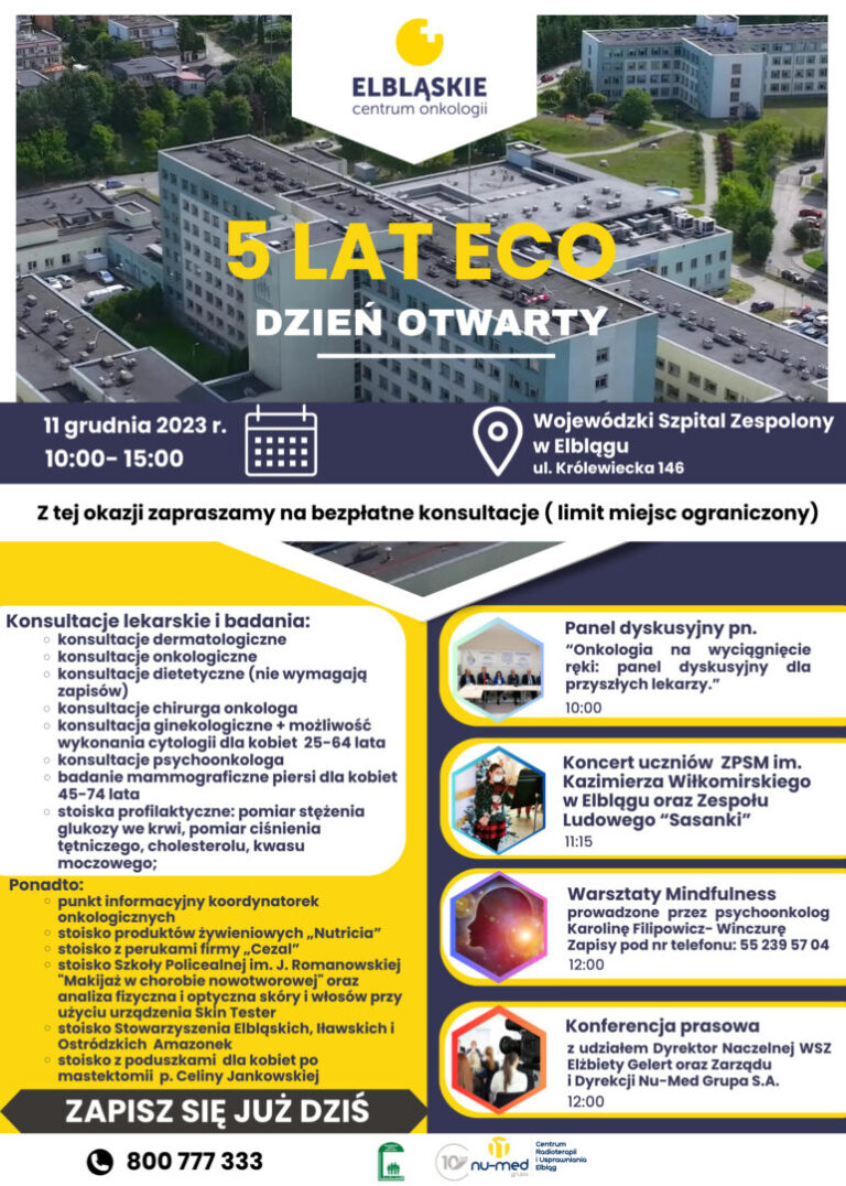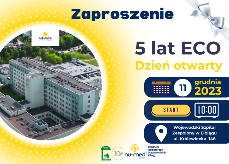 W imieniu Dyrekcji Wojewódzkiego Szpitala Zespolonego w Elblągu zapraszamy Państwa do uczestnictwa w Dniu Otwartym, który odbędzie się w poniedziałek 11 grudnia 2023 r. o godzinie 10:00. Dni Otwarte zostały zorganizowane z okazji jubileuszu 5-lecia istnienia Elbląskiego Centrum Onkologii. W programie znalazły się m.in. bezpłatne konsultacje lekarskie i badania, panel dyskusyjny dla przyszłych lekarzy pn. „Onkologia na wyciągnięcie ręki” oraz Warsztaty Mindfulness.