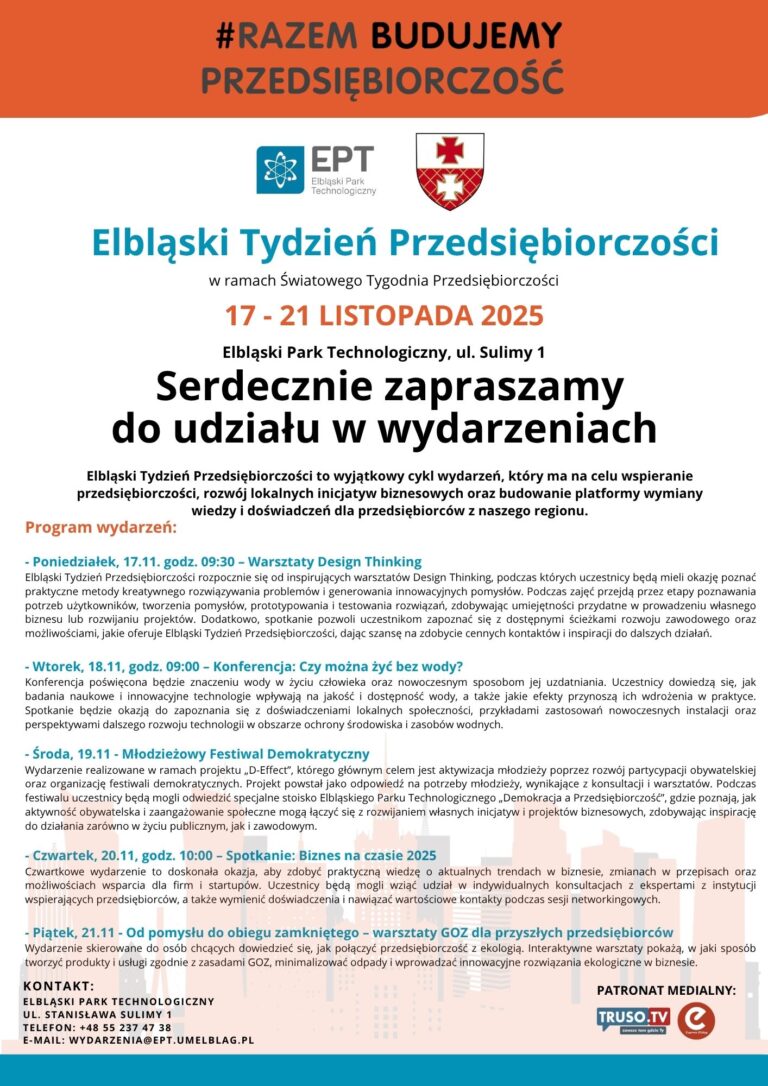 W dniach 17–21 listopada 2025 roku w Elbląskim Parku Technologicznym odbędzie się Elbląski Tydzień Przedsiębiorczości – cykl wydarzeń poświęconych rozwojowi innowacji, przedsiębiorczości oraz aktywności społecznej.