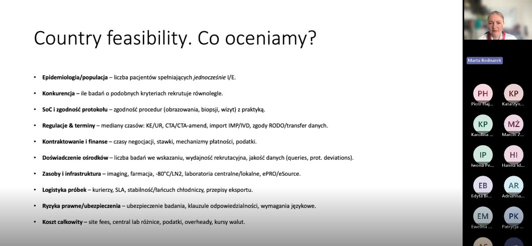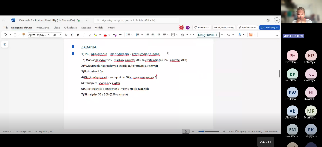 27 września odbyły się zajęcia online w ramach studiów podyplomowych KLIN-BAD (Badania kliniczne i biobankowanie). Podczas spotkania studenci wzięli udział w wykładzie poświęconym analizie wykonalności badań klinicznych (Feasibility study).