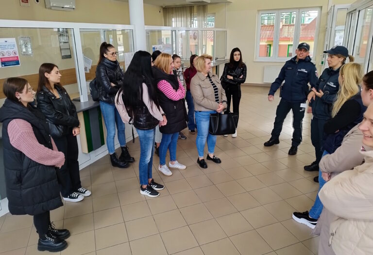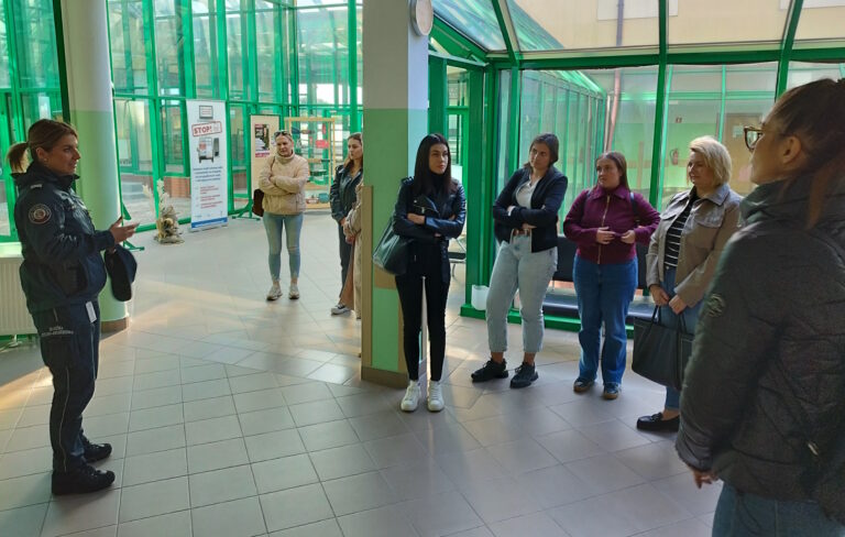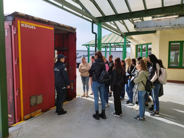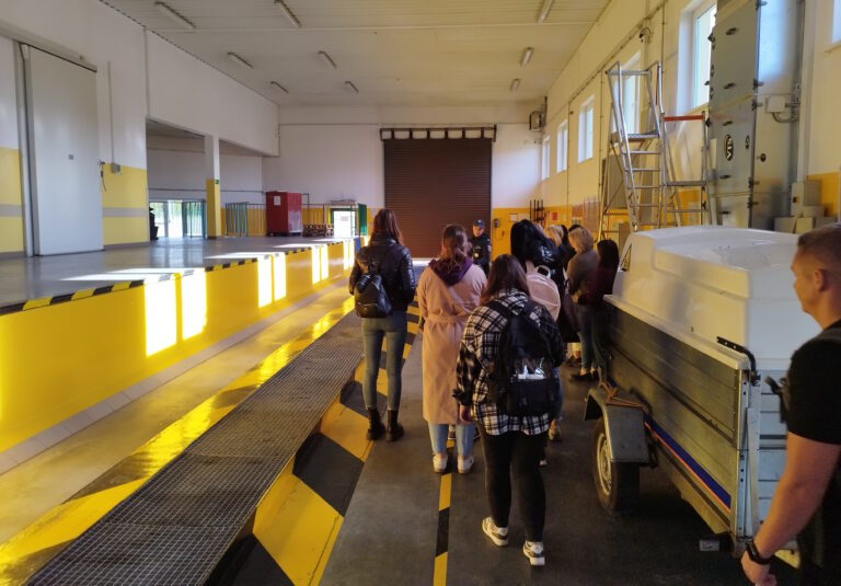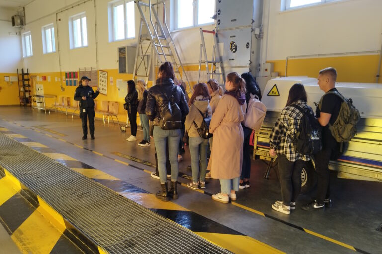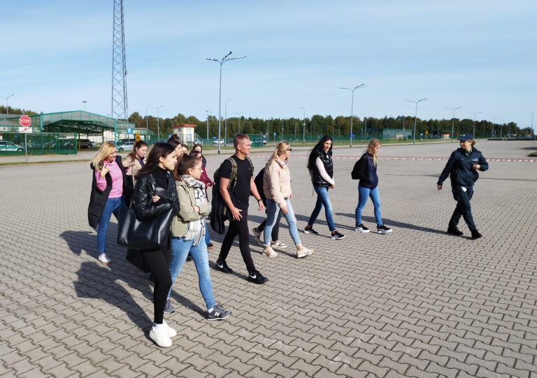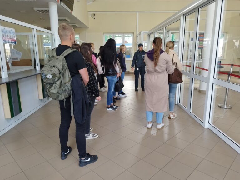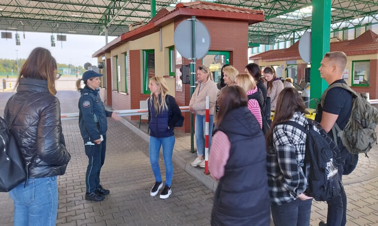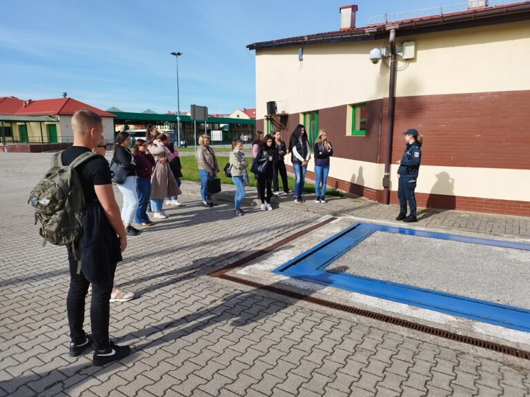 Podczas zwiedzania infrastruktury przejścia przedstawiono miejsca odpraw samochodów osobowych, ciężarowych i autobusów. Funkcjonariusze zaprezentowali różne metody kontroli pojazdów przekraczających granicę, a studenci mogli zobaczyć, jak przebiega przygotowanie do rewizji bagażu i auta – zarówno jego wnętrza, jak i podwozia – w celu wykrycia prób przemytu.