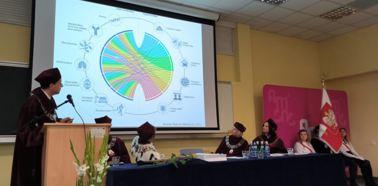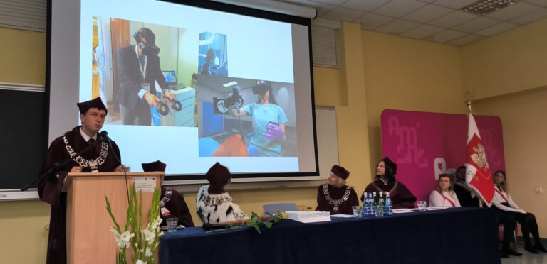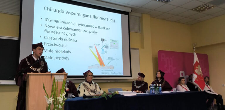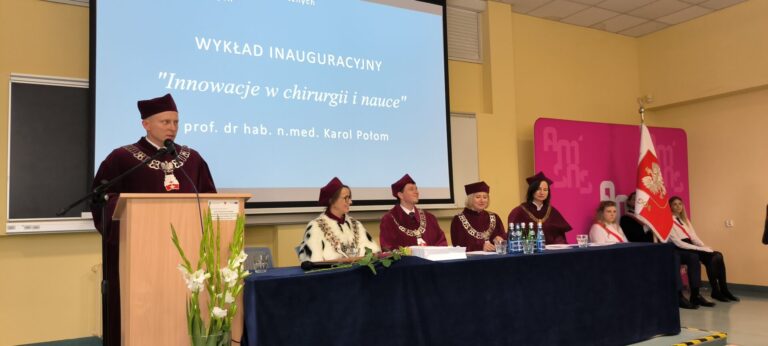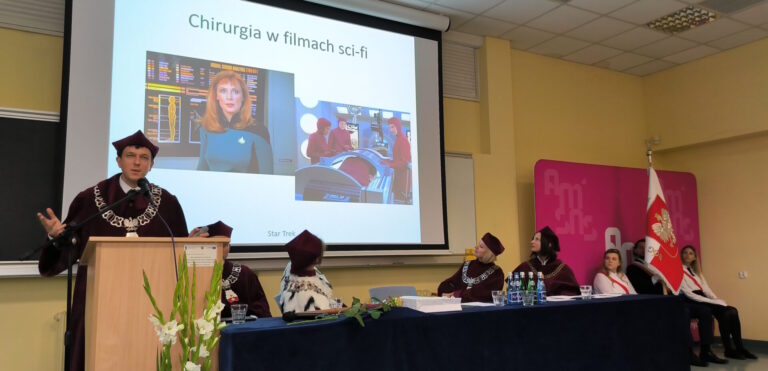 Zwieńczeniem inauguracji był wykład dr hab. Karola Połoma, prorektora ds. nauki na AMiSNS. Niezwykle ciekawe wystąpienie traktowało o innowacji w chirurgii i nauce, a zebrani na sali goście i studenci mieli szansę wysłuchać informacji m.in. o wykorzystaniu w chirurgii preparatów fluorescencyjnych oraz roli sztucznej inteligencji w rozpoznawaniu tkanki nowotworowej.