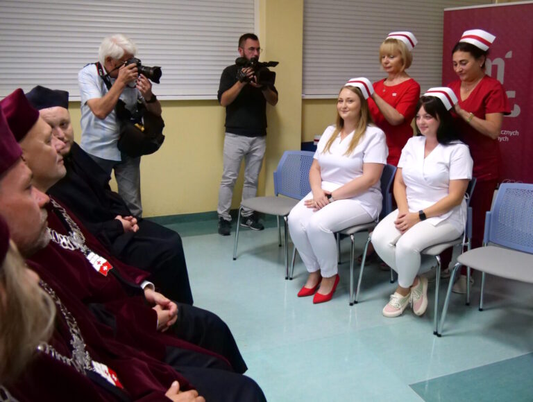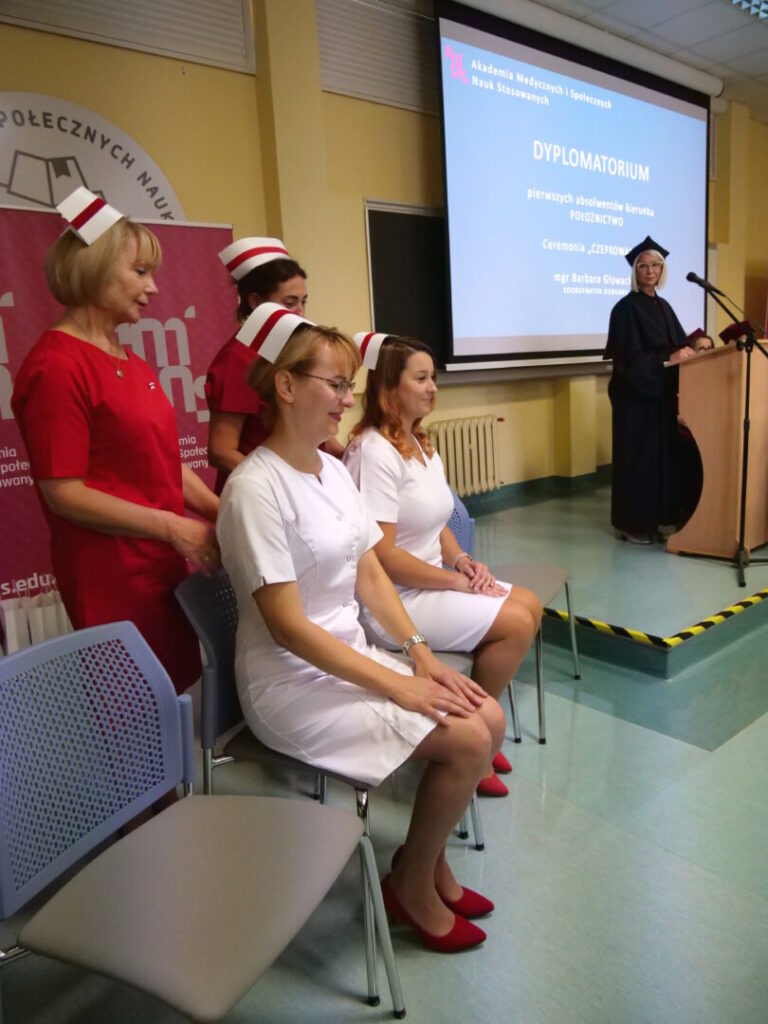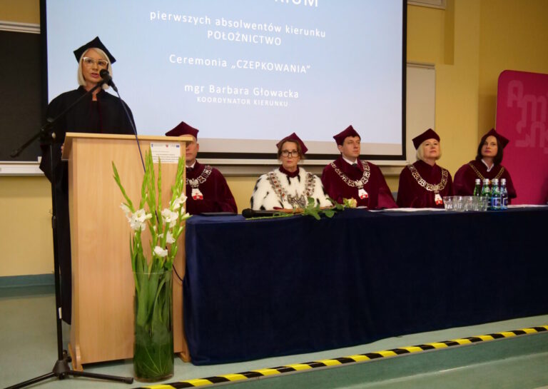 Po oficjalnym przywitaniu wszystkich gości Dziekan Wydziału Nauk o Zdrowiu, dr Anna Tałaj, oraz koordynator kierunku położnictwo i pełnomocnik rektora ds. Centrum Dydaktyki i Symulacji Medycznej, Pani mgr Barbara Głowacka, poprowadziły uroczystość Czepkowania położnych oraz wręczenia dyplomów ośmiu absolwentom kierunku fizjoterapia.