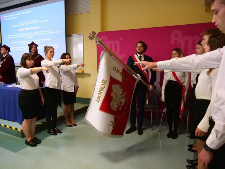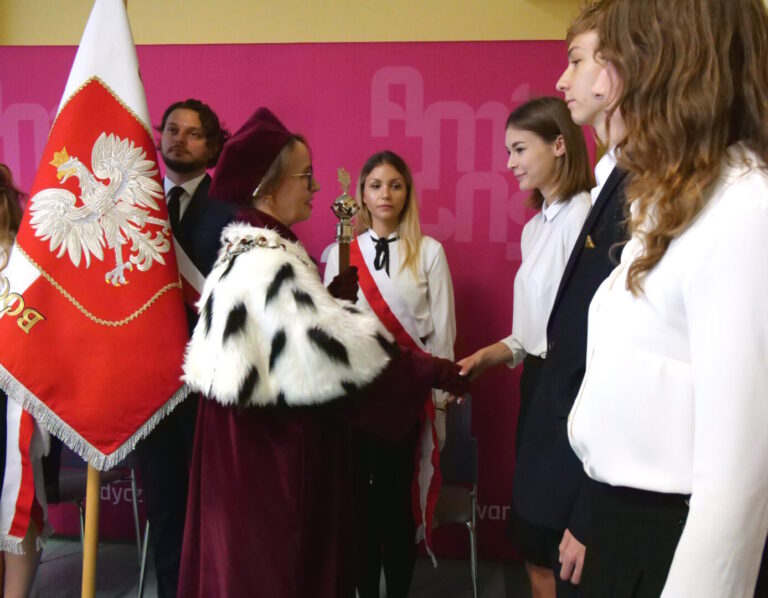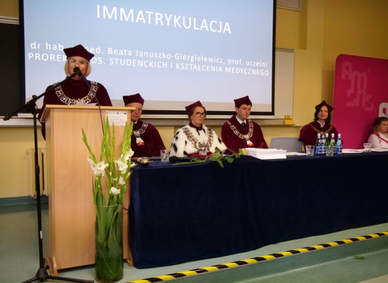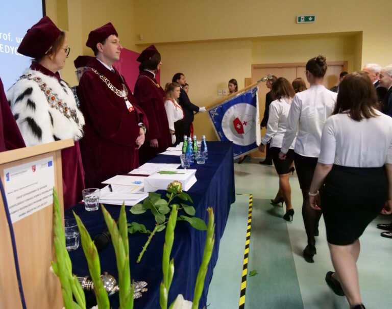 Kolejnym ważnym punktem uroczystości była Immatrykulacja studentów pierwszego roku, przed którą kilka słów wstępu wygłosiła dr hab. n. med. Beata Januszko-Giergielewicz, prorektor ds. studenckich i kształcenia medycznego. Pani prorektor złożyła wszystkim studentom rozpoczynającym rok akademicki życzenia owocnej nauki, po czym wezwała kandydatów na studentów do złożenia uroczystego ślubowania. Następnie Pani Rektor, dr Magdalena Dubiella-Polakowska, pasowała buławą rektorską wytypowanych przedstawicieli wszystkich kierunków studiów. Tę część uroczystości zakończyło przemówienie Pana Mateusza Paradowskiego, Prezydenta Parlamentu Studentów Akademii.