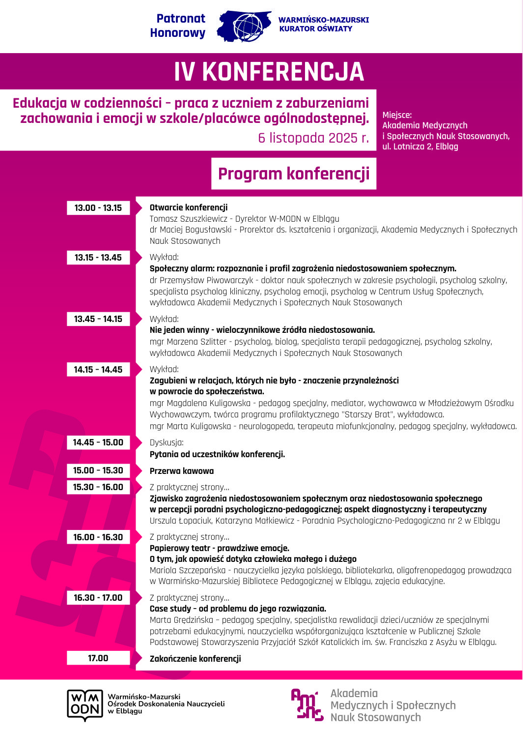 Akademia Medycznych i Społecznych Nauk Stosowanych w Elblągu oraz Ośrodek Doskonalenia Nauczycieli w Elblągu serdecznie zapraszają dyrektorów szkół, przedszkoli i placówek, nauczycieli oraz specjalistów do udziału w IV edycji konferencji poświęconej tematyce pracy z uczniem zagrożonym i niedostosowanym społecznie w warunkach szkoły/placówki ogólnodostępnej.