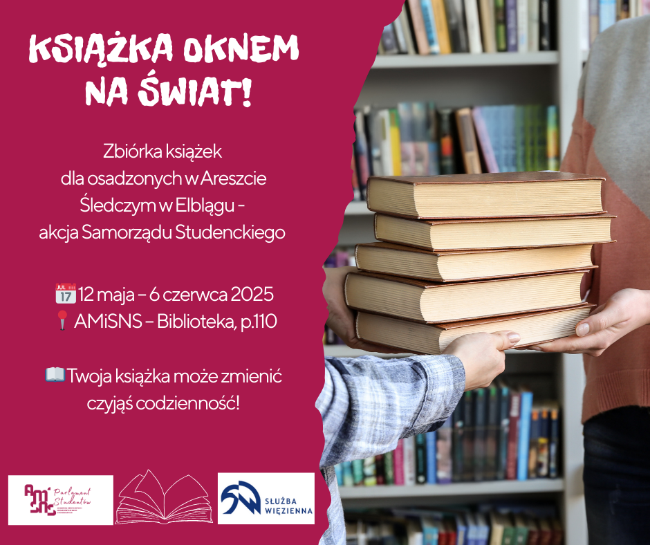 Samorząd Studentów Akademii Medycznych i Społecznych Nauk Stosowanych zaprasza całą społeczność akademicką do udziału w akcji zbiórki książek pod hasłem „Książka oknem na świat”, która potrwa od 12 maja do 6 czerwca 2025 roku.