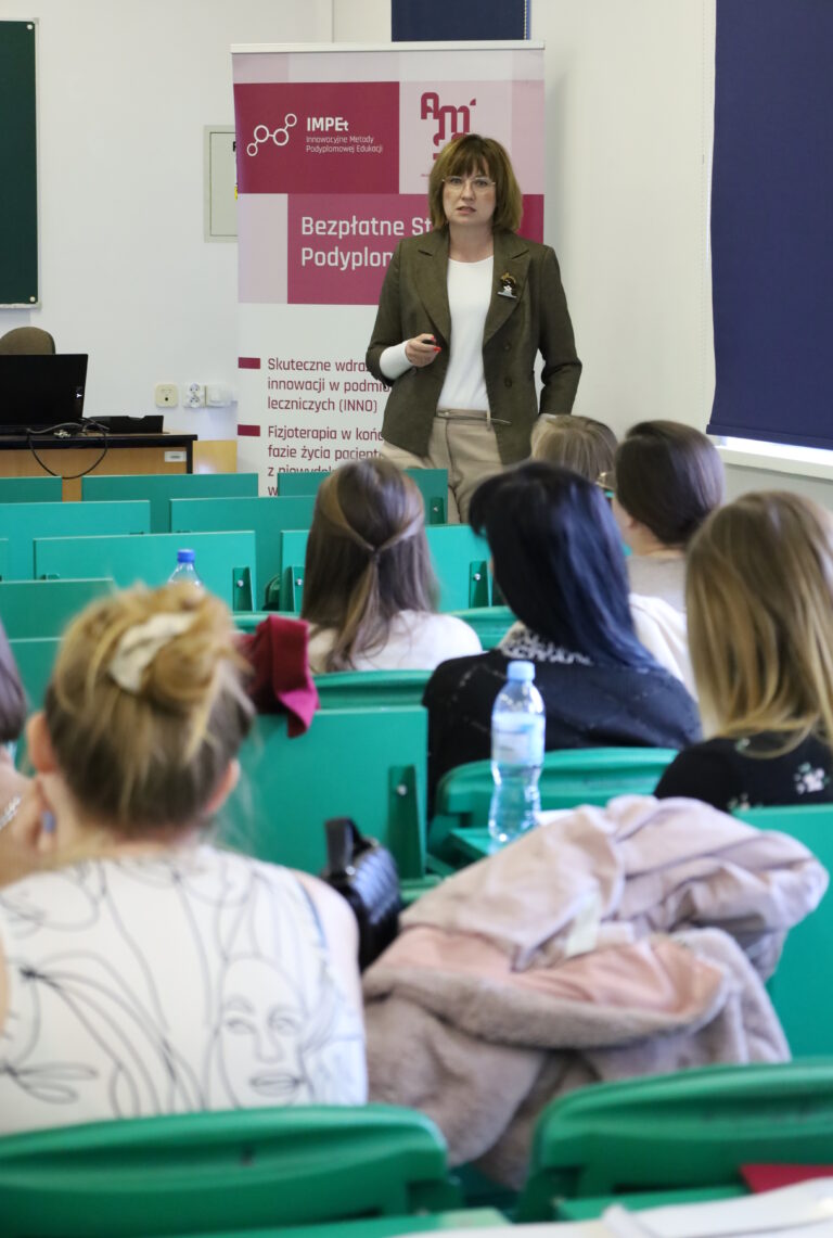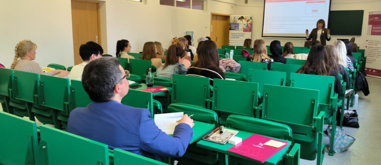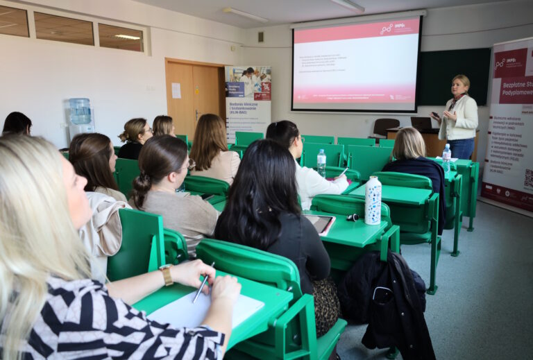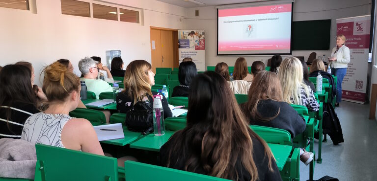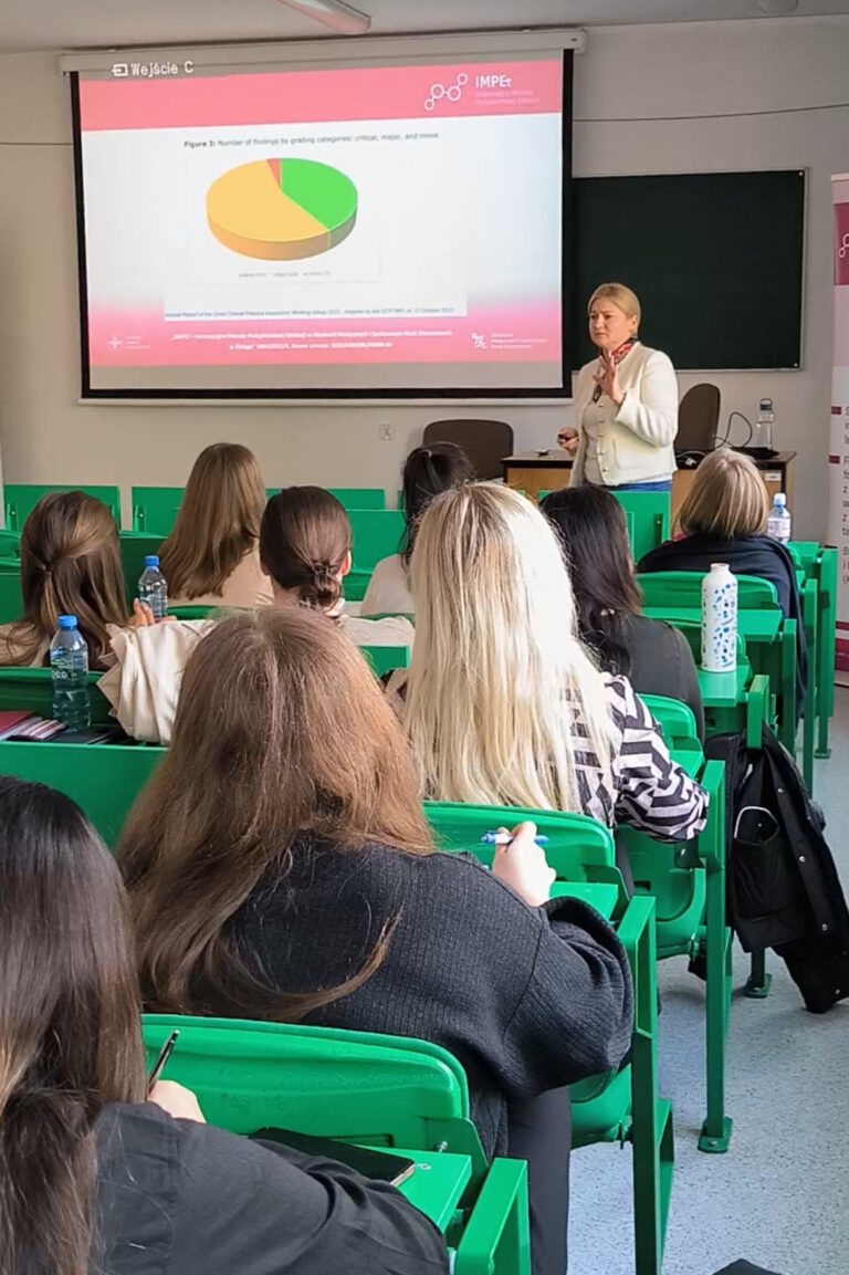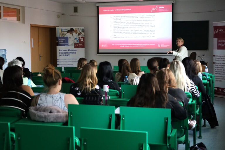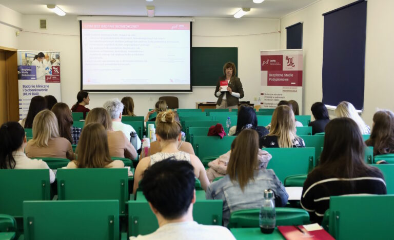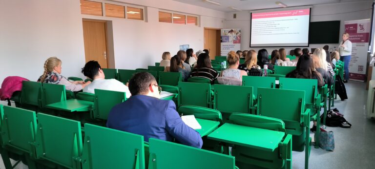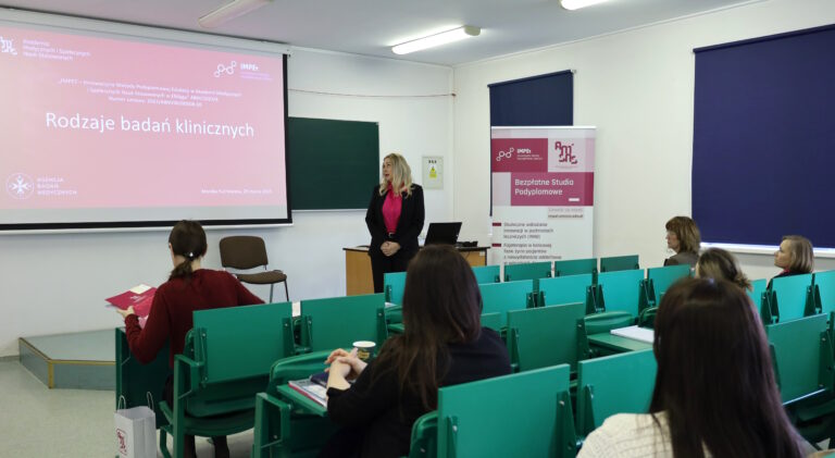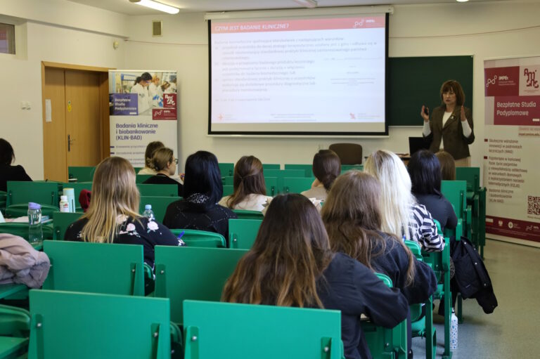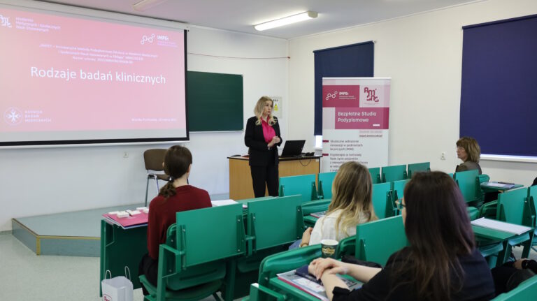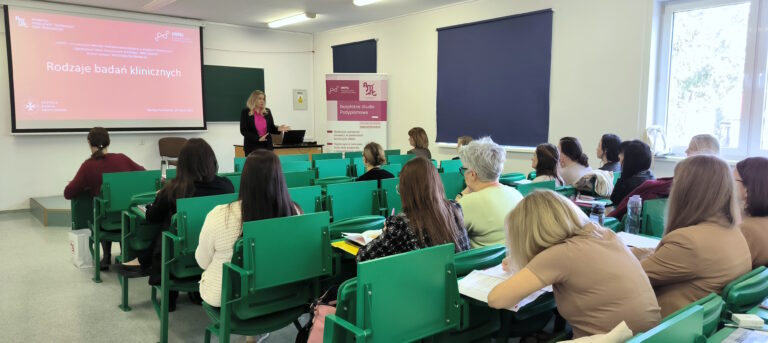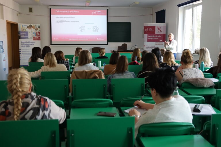 Pierwszego dnia zajęć słuchacze wzięli udział w wykładach prowadzonych przez mgr Monikę Puchowską oraz dr n. med. Martę Bednarek. Omawiane zagadnienia dotyczyły m.in. rodzajów badań klinicznych oraz dokumentacji towarzyszącej badaniu na różnych jego etapach – od przygotowania, przez realizację, aż po jego zakończenie.