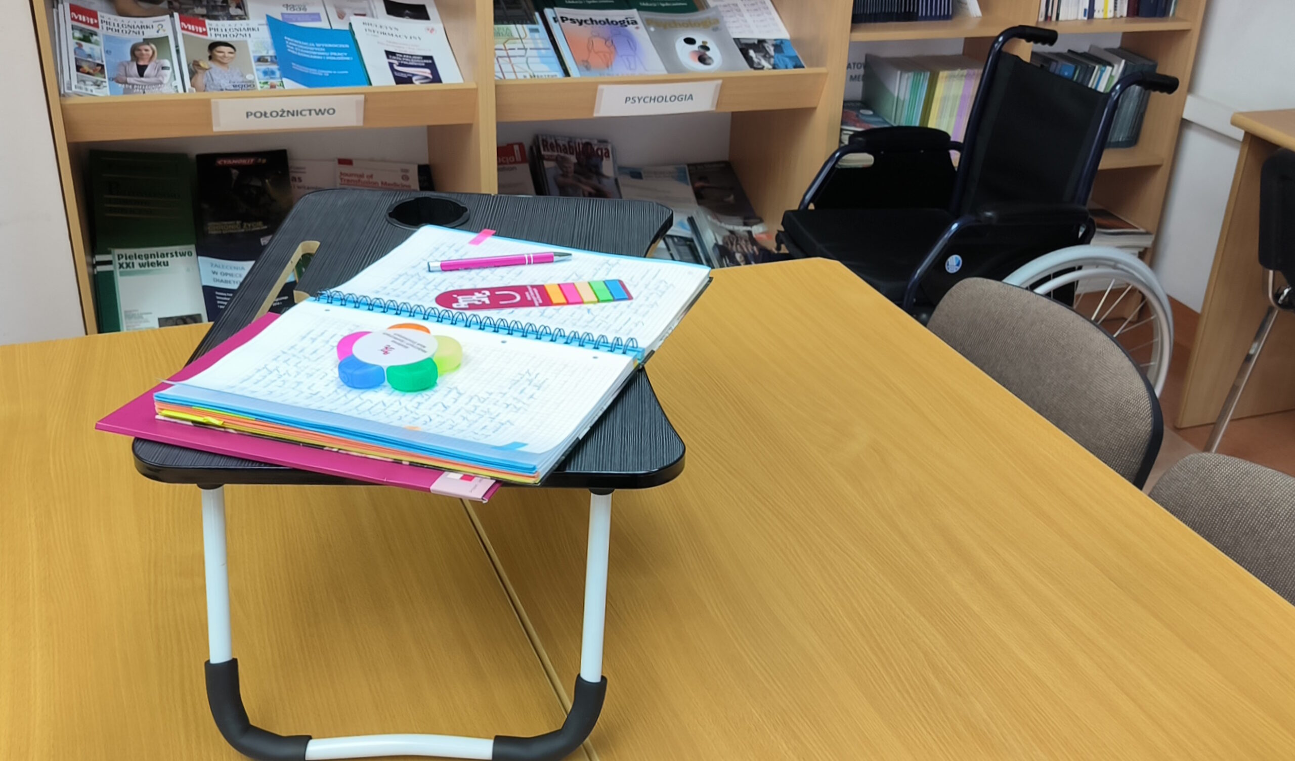 Akademia Medycznych i Społecznych Nauk Stosowanych, dbając o komfort wszystkich studentów, zakupiła stoliki ułatwiające sporządzanie notatek osobom z niepełnosprawnością ruchową.