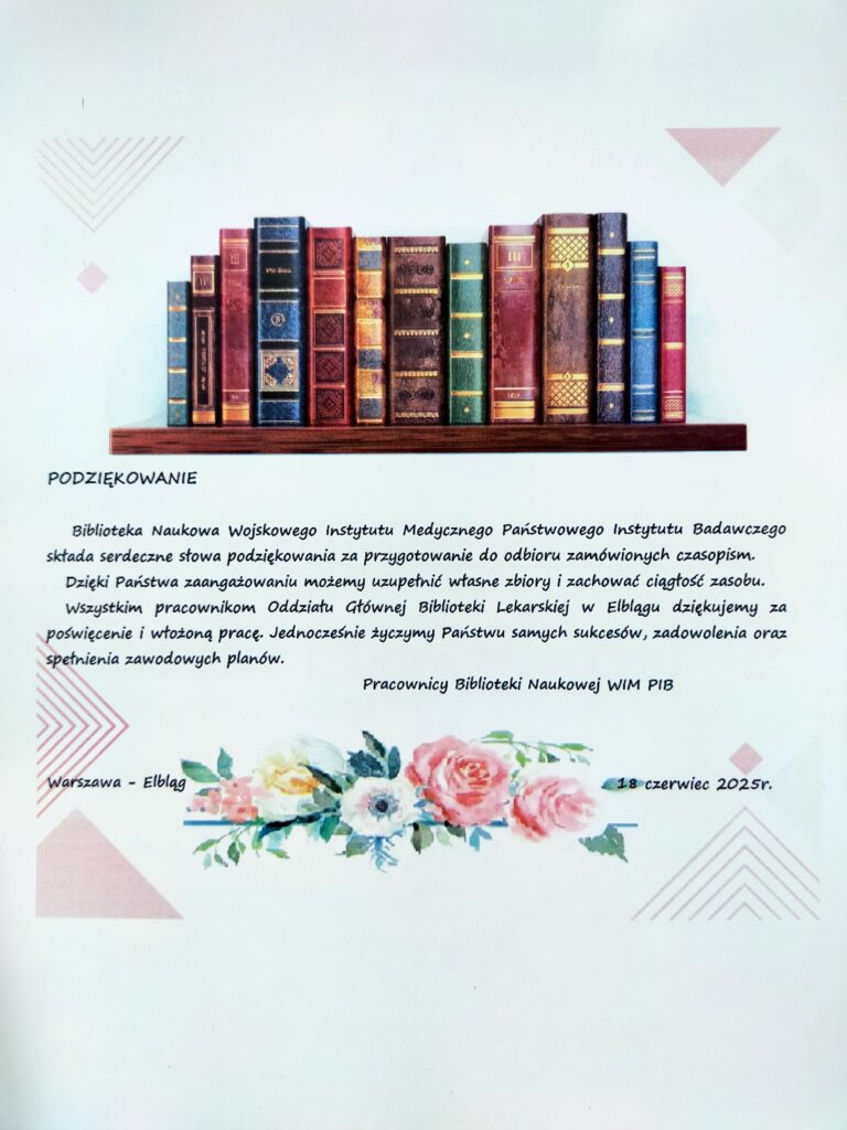 Główna Biblioteka Lekarska, Oddział w Elblągu, z przyjemnością informuje, że w wyniku współpracy z Biblioteką Naukową Wojskowego Instytutu Medycznego Państwowego Instytutu Badawczego wzbogaciła swoje zbiory o dwie niezwykle wartościowe monografie autorstwa Danuty Augustynowicz: