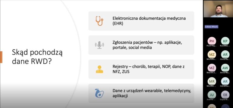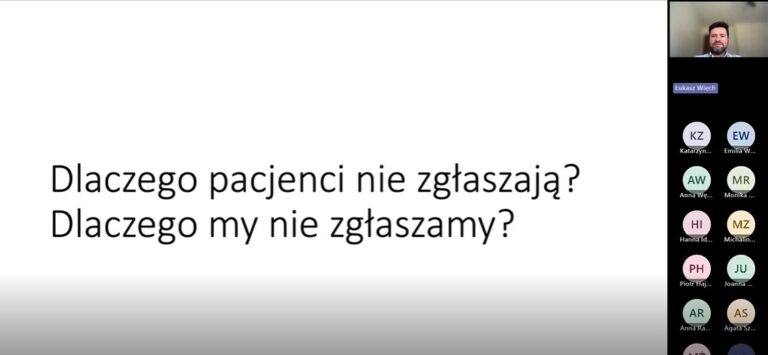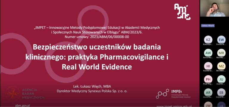 Kolejna część zajęć, prowadzona przez lek. Łukasza Więcha, poświęcona była tematyce bezpieczeństwa pacjentów uczestniczących w badaniach klinicznych. Uczestnicy zapoznali się z zasadami nadzoru nad działaniami niepożądanymi (pharmacovigilance), obowiązkami badaczy w zakresie raportowania zdarzeń oraz specyfiką badań typu real world evidence (RWE). Omawiano aktualne regulacje, praktyczne przykłady analizy ryzyka oraz sposoby reagowania na potencjalne zagrożenia dla uczestników badań.