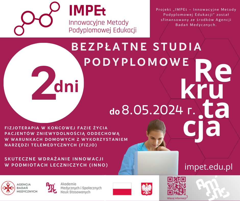 Czas płynie nieubłaganie. Nie czekaj na ostatnią chwilę – zarejestruj się już dziś! bezpłatnych ́ podyplomowych: – Skuteczne wdrażanie innowacji w podmiotach leczniczych (INNO)– Fizjoterapia w końcowej fazie życia pacjentów z niewydolnością oddechową w warunkach domowych z wykorzystaniem telemedycznych (FIZJO) Projekt IMPEt – Innowacyjne Metody Podyplomowej Edukacji w Akademii Medycznych i Społecznych Nauk Stosowanych w Elblągu ma na celu opracowanie i realizację trzech innowacyjnych kierunków studiów podyplomowych w dziedzinie nauk biomedycznych.