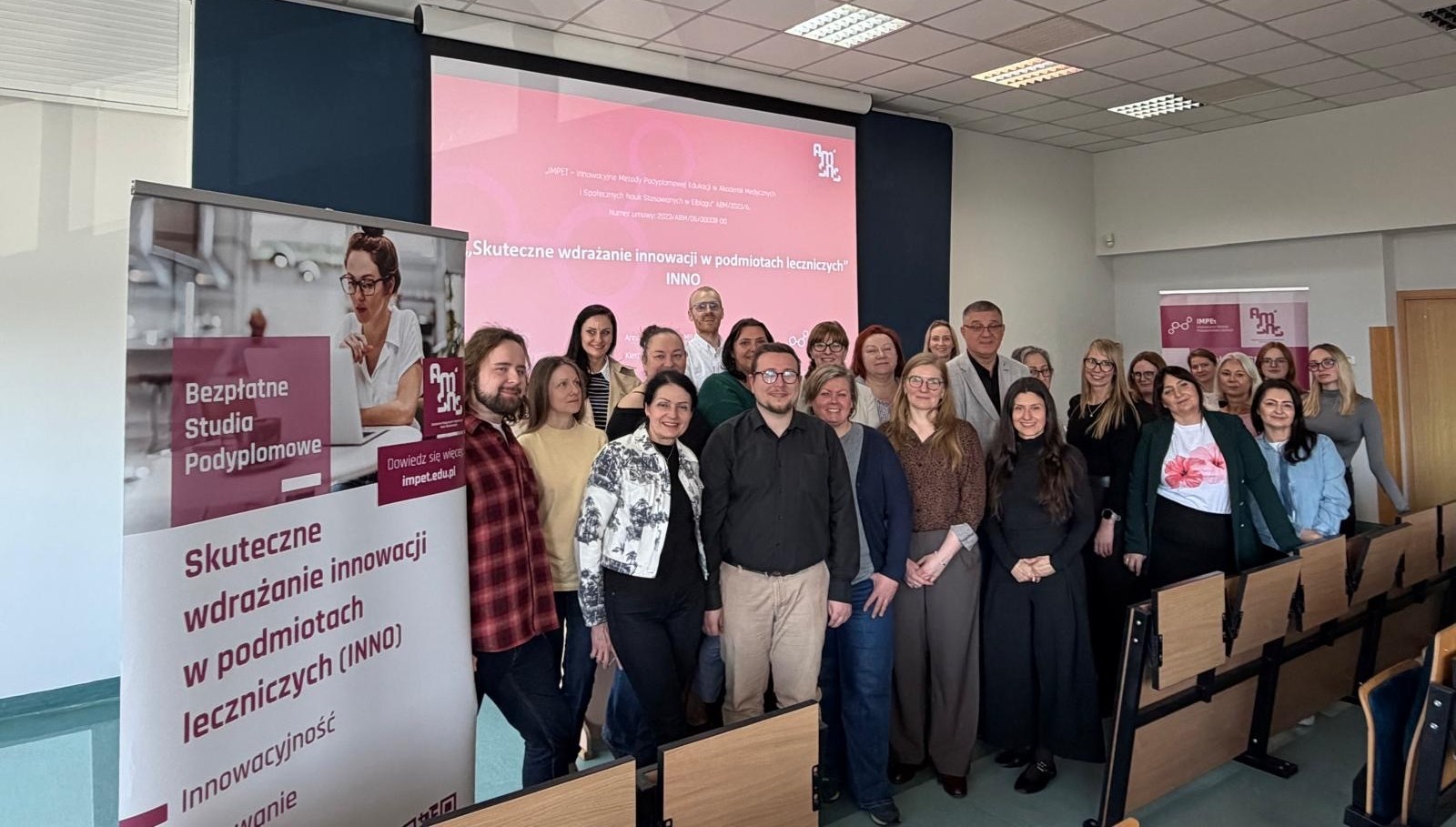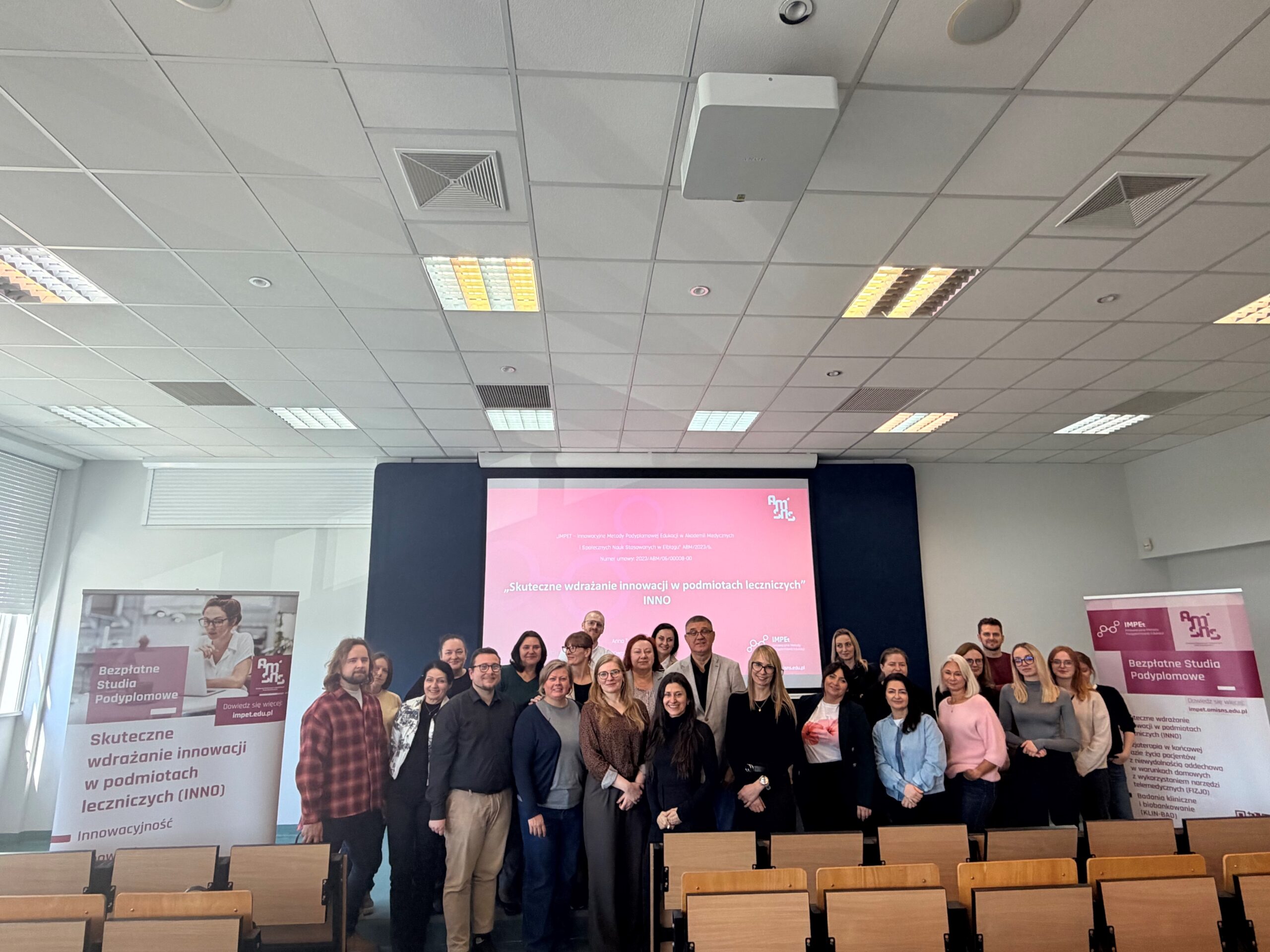 W dniach 18 i 19 kwietnia 2026 roku odbyło się pierwsze spotkanie stacjonarne w ramach II edycji studiów podyplomowych „Skuteczne wdrażanie innowacji w podmiotach leczniczych (INNO)”, realizowanych przez Akademię Medycznych i Społecznych Nauk Stosowanych. Anna Tybińkowska, kierownik merytoryczna studiów, oraz dr Jakub Chwiećko swoimi wykładami zainaugurowali nową edycję studiów.