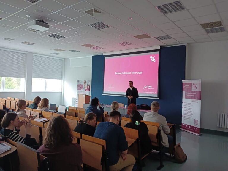 Zajęcia obejmowały również ramy regulacyjne, prawne i systemowe innowacji w ochronie zdrowia – ze szczególnym uwzględnieniem MDR, RODO oraz poziomów gotowości technologicznej (TRL). Wspólnie analizowaliśmy, jak w praktyce oceniać dojrzałość rozwiązań oraz ich rzeczywistą gotowość do wdrożenia w podmiotach leczniczych.