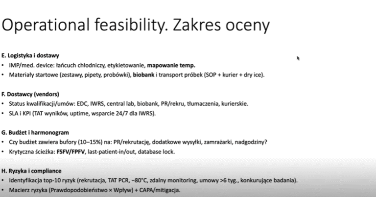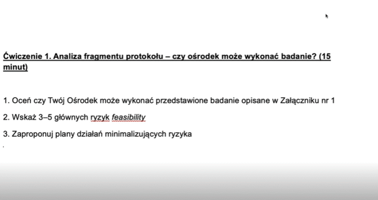 Podczas warsztatu „Feasibility study (analiza wykonalności) w badaniach klinicznych” uczestnicy poznali znaczenie oceny wykonalności badania przed jego rozpoczęciem. Omówiono m.in. analizę potencjału ośrodka, dostępność populacji pacjentów, ocenę zasobów kadrowych oraz ryzyk organizacyjnych, które mają kluczowy wpływ na powodzenie projektu klinicznego.
