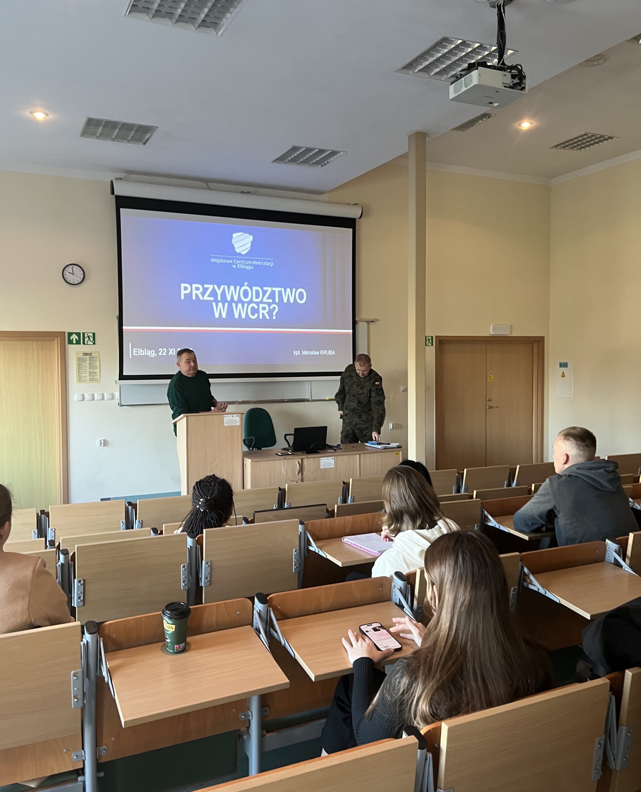 Wojskowe Centrum Rekrutacji jest bardzo specyficzną instytucją, realizującą bardzo złożone i specyficzne zadania, niezbędne do funkcjonowania jednostek i instytucji wojskowych. WCR nie jest może bezpośrednio „w boju”, jednak jego rola w działaniach i funkcjonowaniu Sił Zbrojnych jest zarówno specyficzna jak i niezbędna i konieczna, a jednocześnie bardzo złożona i jakże często niewdzięczna. Właśnie kontekst tej specyfiki był podstawą wykładu – analizy Pana kapitana Kruby. Dowodzenie tego typu instytucją to proces bardzo złożony, a wypracowanie metod przywództwa w dowodzeniu WCR dodaje wykładowi połączonemu z analizą tematu specyficzny „smak”. Zatem było ciekawie, intrygująco, naukowo, teoretycznie, ale i praktycznie. Właśnie o to nam chodziło.