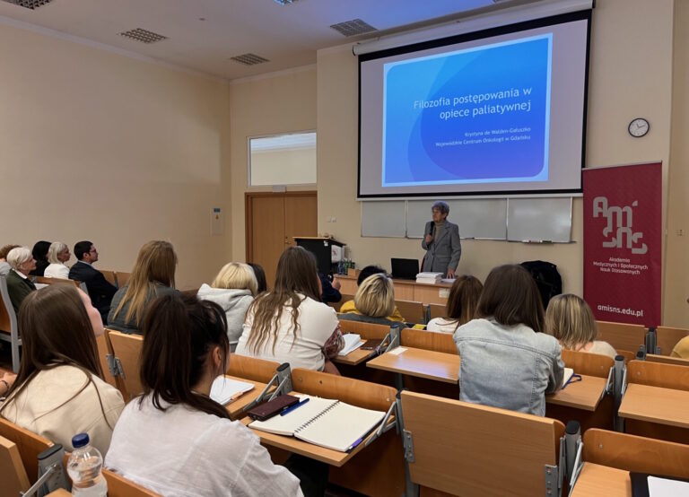 11 maja 2024 r. w Akademii Medycznych i Społecznych Nauk Stosowanych mieliśmy zaszczyt gościć wybitną osobistość, Panią Profesor dr hab. Krystynę de Walden-Gałuszko, wiceprezes Polskiego Towarzystwa Psychoonkologicznego, która jest również doświadczonym psychiatrą i psychoonkologiem. Pani Profesor wygłosiła inspirujący wykład pod tytułem „Psychologiczne problemy osób u kresu życia”, w którym szczegółowo omówiła zadania opieki paliatywnej oraz potrzeby psychologiczne i somatyczne pacjentów znajdujących się na tym etapie życia. Spotkanie rozwinęło się w fascynującą dyskusję, w której Pani Profesor przedstawiła liczne przykłady z własnej praktyki, ilustrując potrzeby psychiczne osób u kresu życia. Słuchacze, w tym studenci psychologii, pedagogiki, pielęgniarstwa i położnictwa, aktywnie angażowali się w wykład, zadając pytania i dzieląc się swoimi przemyśleniami, co wzbogaciło całe spotkanie.