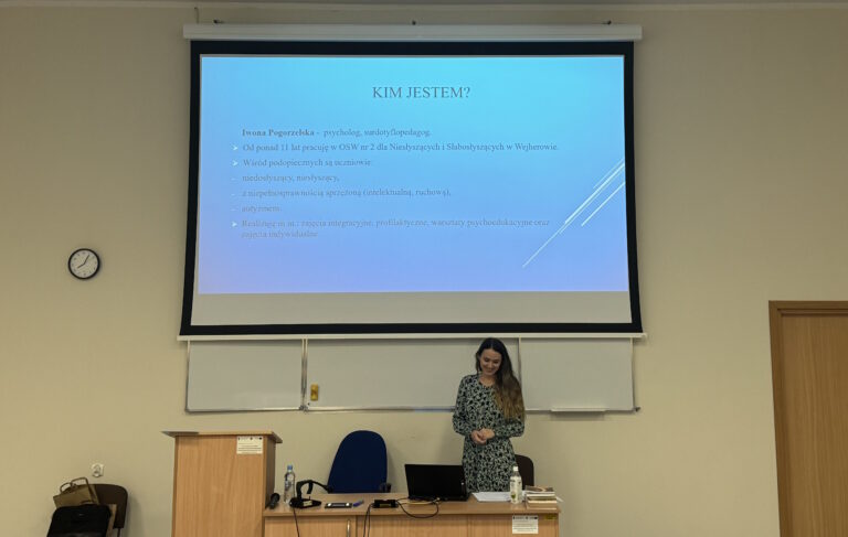 W niedzielę, 5 stycznia 2025 roku, odbyło się inspirujące spotkanie prowadzone przez Panią Iwonę Pogorzelską – psychologa i surdotyflopedagoga z 11-letnim doświadczeniem pracy w Ośrodku Szkolno-Wychowawczym dla Niesłyszących i Słabosłyszących w Wejherowie. Wydarzenie zorganizowano na zaproszenie Pani Joanny Kawieckiej w ramach zajęć z przedmiotu „Psychologiczne problemy niepełnosprawności”. W spotkaniu wzięli udział studenci V roku psychologii.