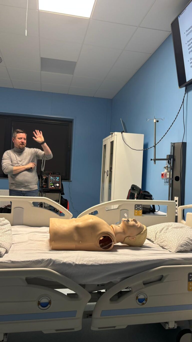 Istotnym elementem zajęć było również wykorzystanie respiratora, dzięki czemu studenci mogli zapoznać się z praktycznymi aspektami wspomagania oddechu w warunkach symulowanych. Takie podejście umożliwia odwzorowanie realnych sytuacji klinicznych i przygotowuje do pracy w zawodzie.