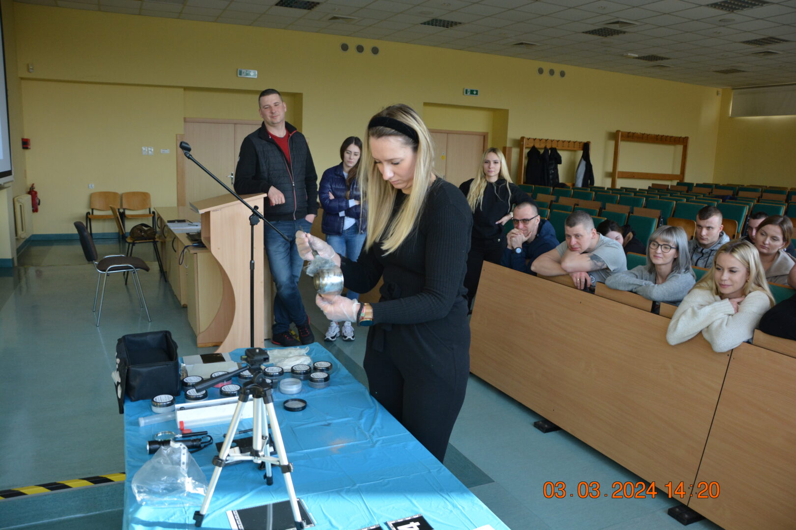 Podczas zajęć ekspert kryminalistyki podzielił się doświadczeniami w zabezpieczaniu śladów na miejscu zdarzenia.