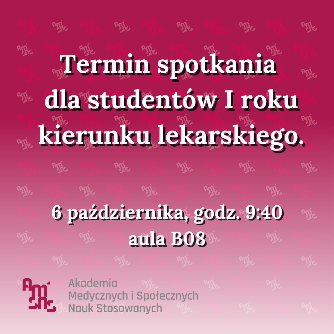 Informujemy, że 6 października 2025 r. o godzinie 9:40 w auli B08 odbędzie się spotkanie organizacyjne dla studentów I roku kierunku lekarskiego. Podczas zebrania omówione zostaną najważniejsze kwestie związane z rozpoczęciem studiów, a także odbędzie się spotkanie z przedstawicielami banku dotyczące kredytu studenckiego.