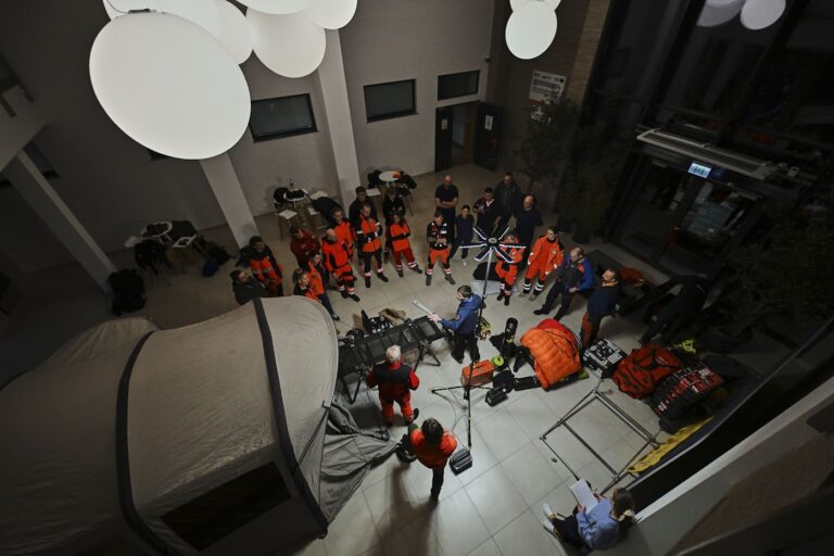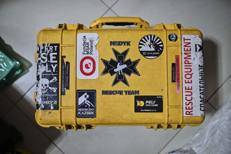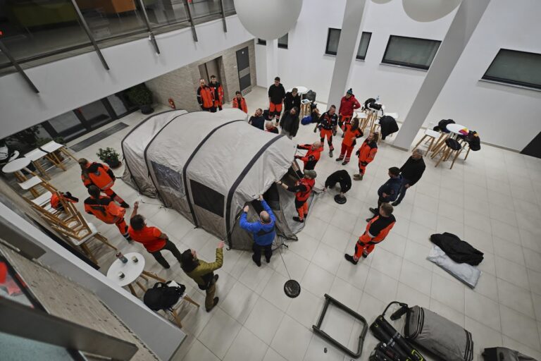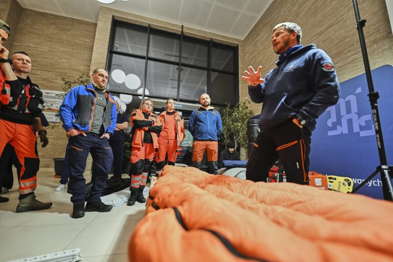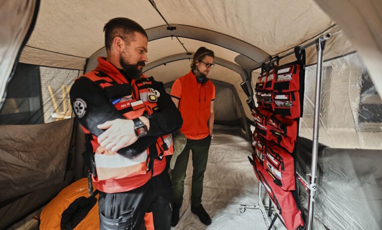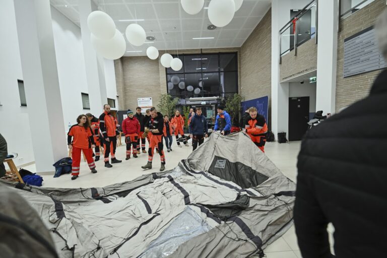W części praktycznej zajęć eksperci przeprowadzili warsztaty z budowania namiotowego punktu medycznego, stosowanego podczas zabezpieczeń wypraw ekstremalnych. W holu Centrum Dydaktyki i Symulacji Medycznej AMiSNS stanął punkt ratowniczy inspirowany stanowiskiem ze zbocza góry Kazbek. Każdy element wyposażenia został szczegółowo omówiony, a jego zastosowanie zaprezentowane w praktyce, umożliwiając studentom zrozumienie zasad funkcjonowania takiego polowego „szpitala”.