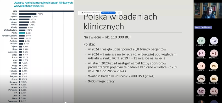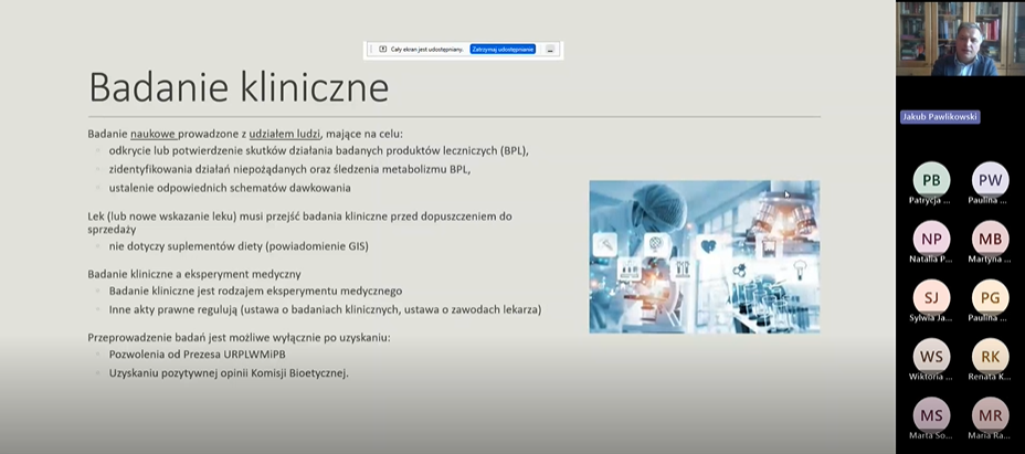 Pierwszy wykład nowej edycji poprowadził prof. dr hab. Jakub Pawlikowski, który wprowadził uczestników w tematykę badań klinicznych. Omówił m.in. podstawowe etapy rozwoju produktów leczniczych, zasady randomizacji i zaślepienia, strukturę protokołu badania oraz kluczowe założenia Dobrej Praktyki Klinicznej (GCP). Wykład stanowił solidne wprowadzenie teoretyczne do zagadnień, które będą rozwijane podczas dalszych zajęć.