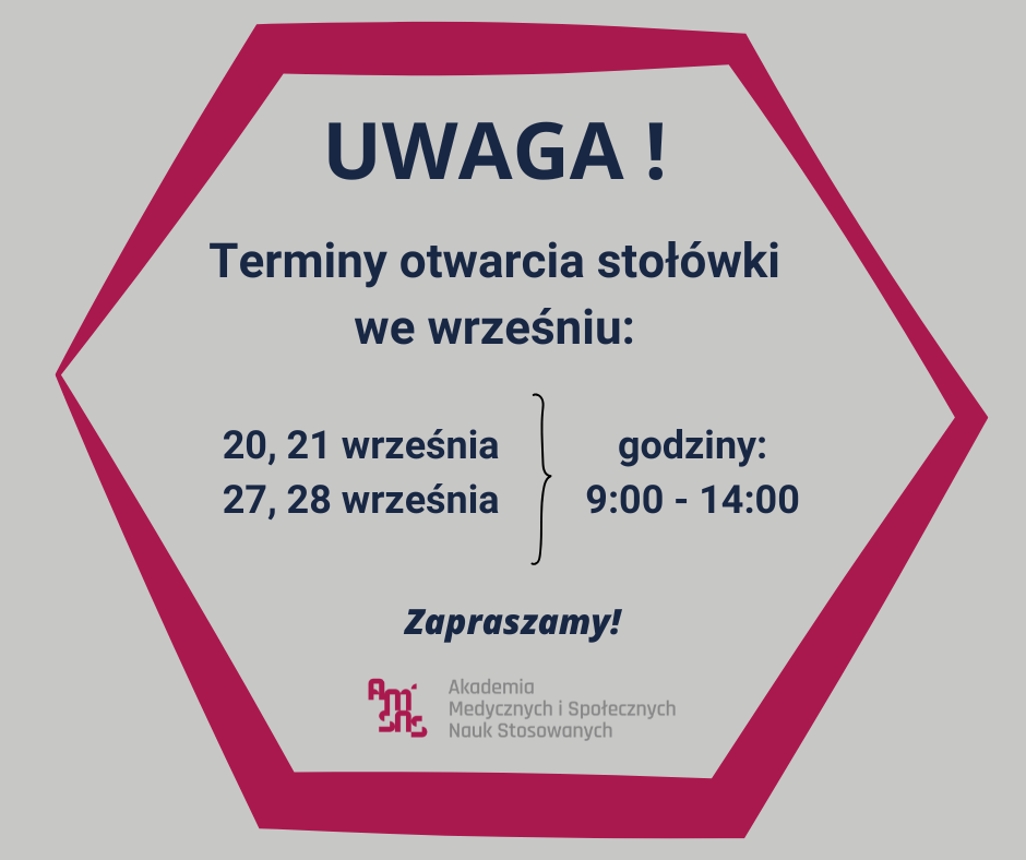 Stołówka AMiSNS – harmonogram pracy we wrześniuStrona Główna / Główne aktualności / Stołówka AMiSNS – harmonogram pracy we wrześniu Data publikacji:19.09.202518.09.2025