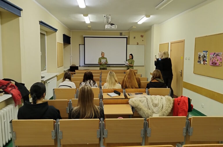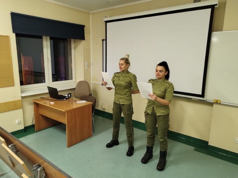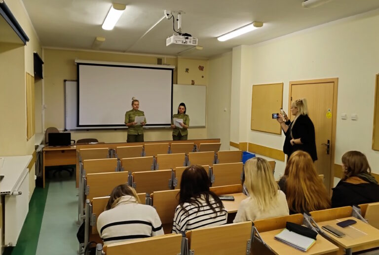 To jednak nie wszystko – studentki poszły o krok dalej, prezentując swoje wystąpienie w mundurach Straży Granicznej. Dzięki takiej wyjątkowej oprawie ich prezentacja nabrała realizmu i profesjonalizmu, co spotkało się z dużym uznaniem zarówno ze strony prowadzącego zajęcia, jak i kolegów z grupy.