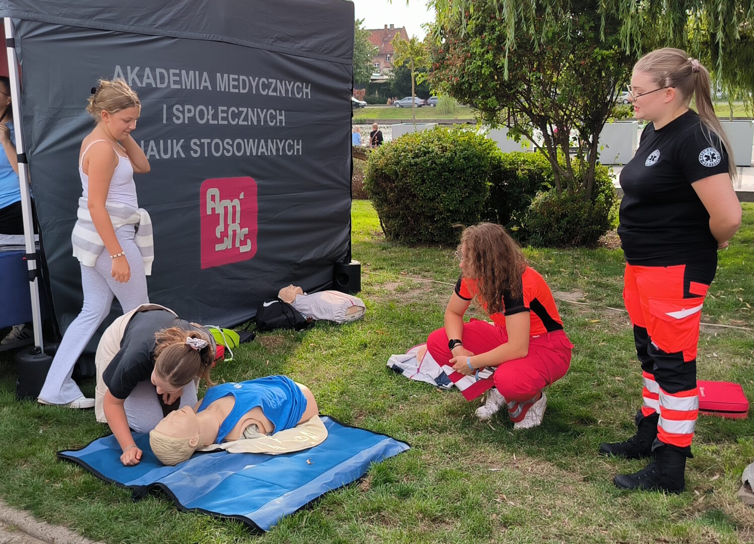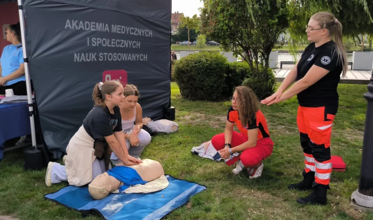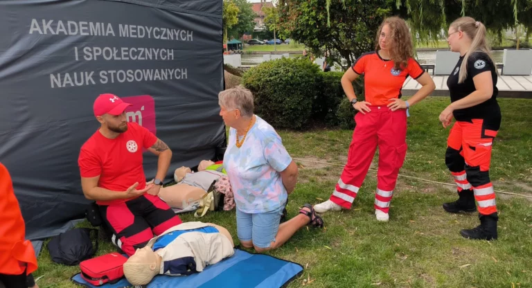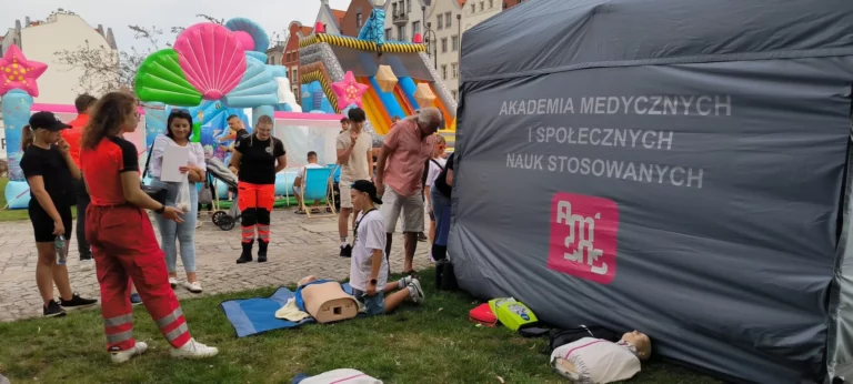 Święto Chleba stanowi doskonałą okazję do spotkania z mieszkańcami Elbląga oraz wspólnego promowania zdrowego stylu życia i nauki udzielania pierwszej pomocy. Wczoraj, 23 sierpnia, studenci ratownictwa medycznego AMiSNS demonstrowali, jak należy postępować w sytuacjach zagrożenia życia i zdrowia oraz udzielali odpowiedzi na liczne pytania. Wraz z nimi obecny był Pan Piotr Kaczyński, doświadczony ratownik i wykładowca AMiSNS, który chętnie dzielił się swoją wiedzą i bogatym doświadczeniem.