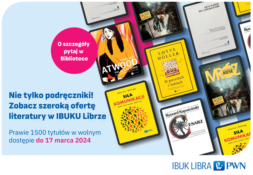 W marcu, jak co roku, obchodzony jest tydzień e-książki. Jak zawsze z tej okazji wypożyczalnia online IBUK Libra przyłącza się do świętowania. W tym roku z okazji Tygodnia E-książki Wydawnictwo PWN udostępniło prawie 1500 publikacji beletrystycznych! Tradycyjnie też tydzień w IBUK Librze trwa nieco dłużej, więc dodatkowe publikacje są dostępne dla czytelników do 17 marca br. Po szczegóły akcji zapraszamy do Oddziału Głównej Biblioteki Lekarskiej w Elblągu: