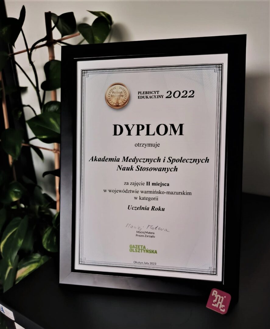Akademia Medycznych i Społecznych Nauk Stosowanych zajęła II miejsce w województwie warmińsko-mazurskim w plebiscycie edukacyjnym 2022 jako UCZELNIA ROKU!Nagrodę, poprzez głosowanie, przyznali studenci dla których poza aspektem edukacyjnym, ważne były kwestie organizacyjne oraz jakość komunikacji i obsługi oferowana przez szkołę wyższą.Bardzo dziękujemy za wyróżnienie!!!