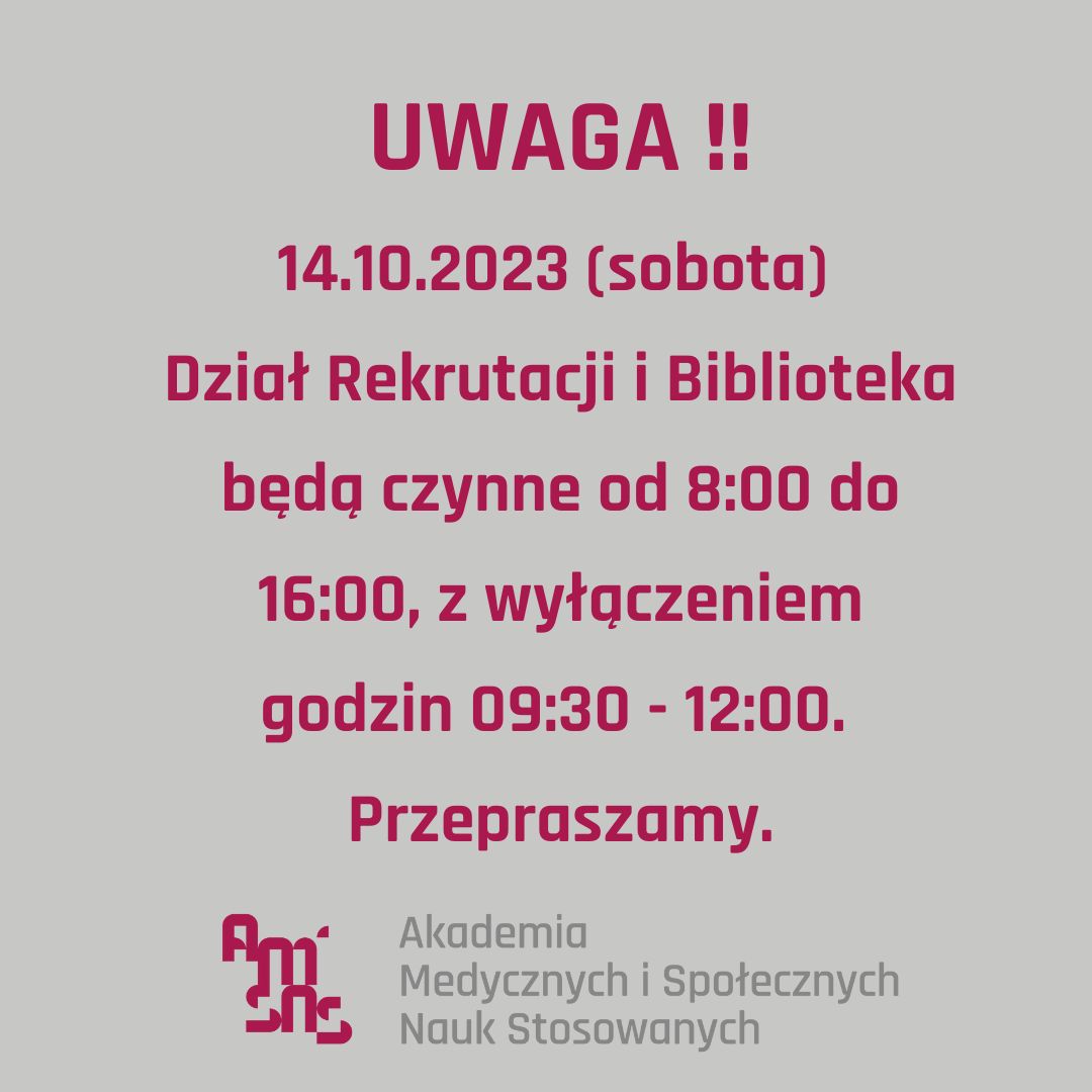 Uwaga – inne godziny pracy Biblioteki i Centrum Rekrutacji w dniu 14 października.Strona Główna / Główne aktualności / Uwaga – inne godziny pracy Biblioteki i Centrum Rekrutacji w dniu 14 października. Data publikacji:13.10.2023