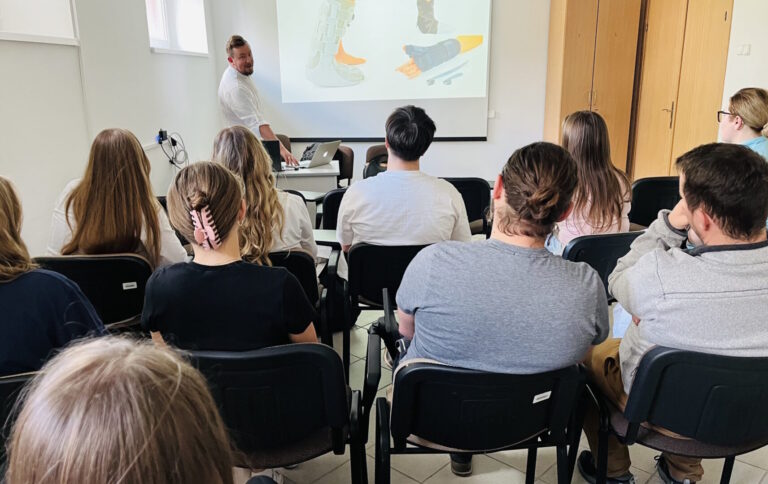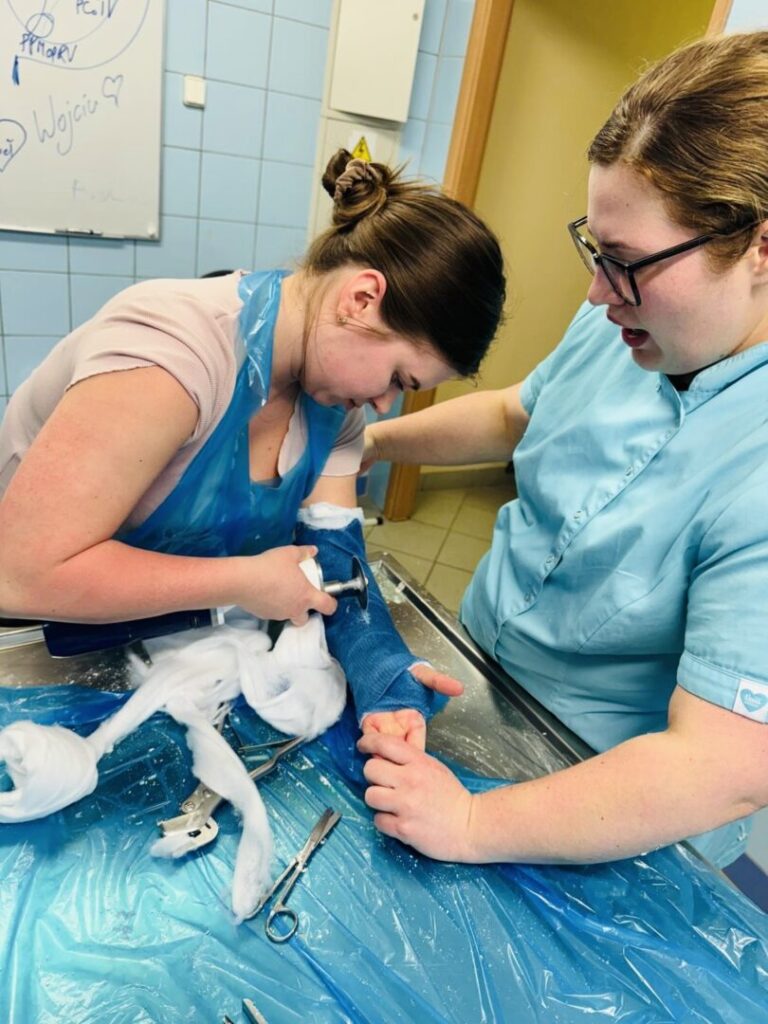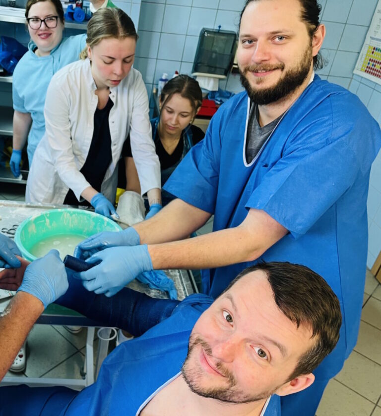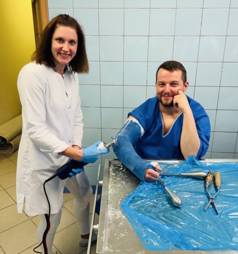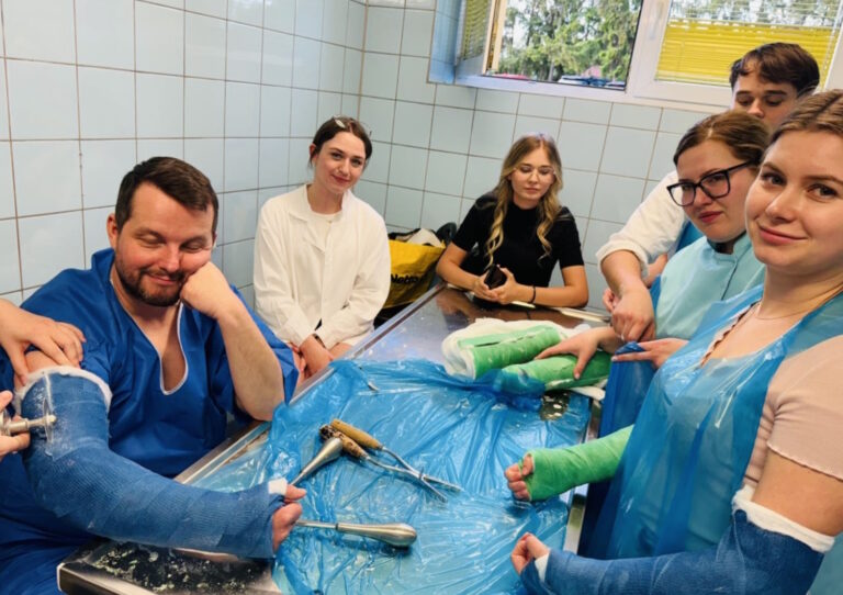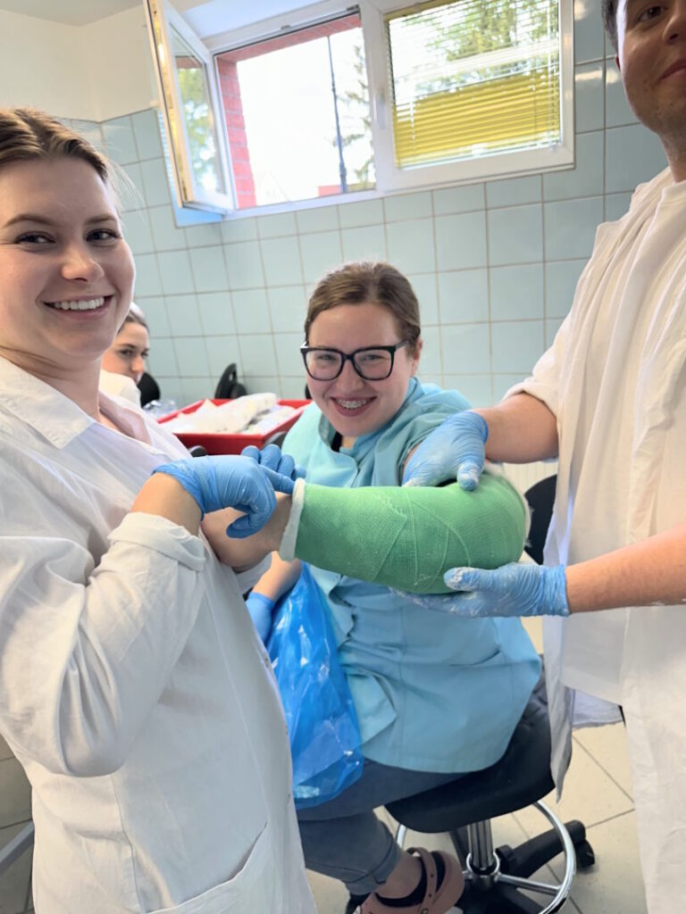 W części warsztatowej spotkania odbyły się zajęcia praktyczne, w trakcie których studenci kierunku lekarskiego mieli możliwość samodzielnego zakładania gipsu oraz zapoznania się z materiałami gipsowymi. Studenci, przy pomocy narzędzi ortopedycznych, mieli również szansę sprawdzić się w zdejmowaniu sobie nawzajem unieruchomień.