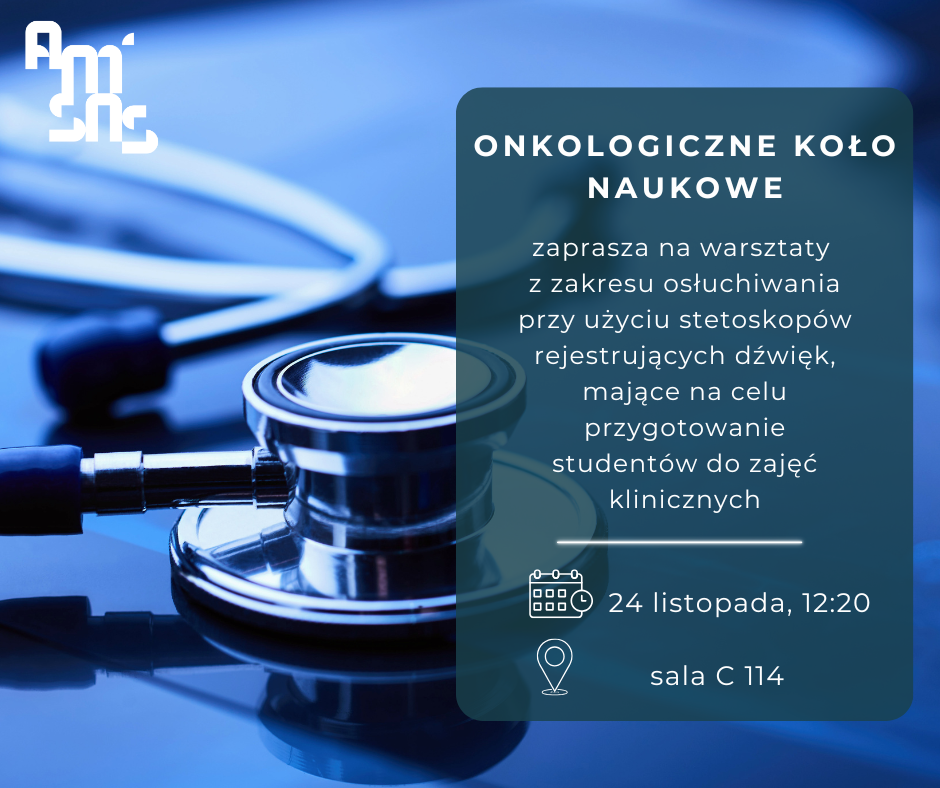 W imieniu Onkologicznego Koła Naukowego zapraszamy studentów na stacjonarne warsztaty z osłuchiwania przy użyciu stetoskopów rejestrujących dźwięk. Zajęcia mają na celu praktyczne przygotowanie do przyszłych zajęć klinicznych oraz rozwijanie umiejętności niezbędnych w pracy z pacjentem.