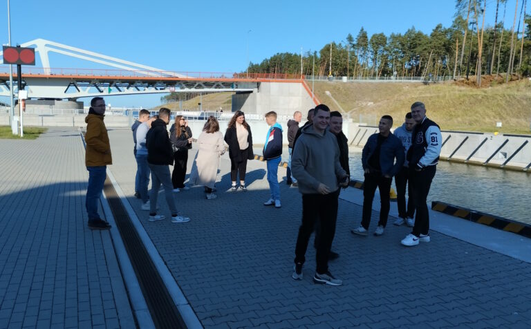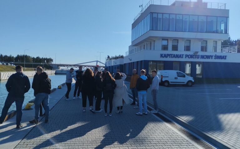 Następnie studenci udali się do MPG w Nowym Świecie gdzie Komendant przedstawił infrastrukturę przejścia oraz sposób dokonywania odpraw. Była to również doskonała okazja do zapoznania się z funkcjonowaniem tej niezwykłej drogi wodnej jaką jest kanał przez Mierzeję Wiślaną. O zasadach ruchu na tym akwenie i urządzeniach kanału doskonale opowiedzieli Kapitanowie pełniący służbę w Kapitanacie Portu Nowy Świat.