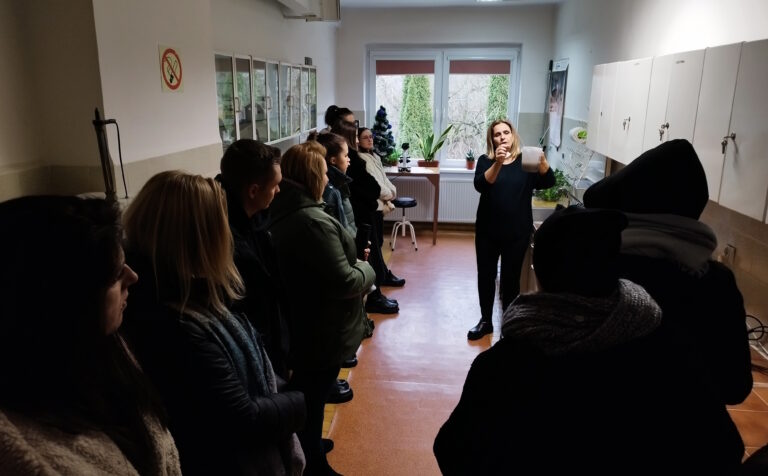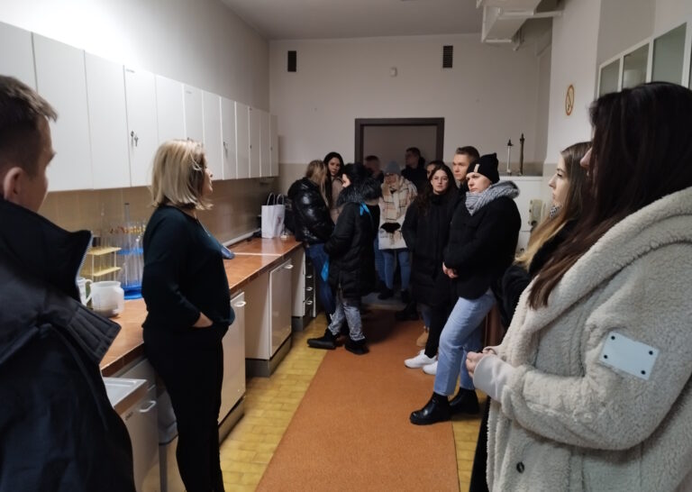 Pani mgr inż. Ewa Grabowska – kierowniczka laboratorium PUW-K – w trakcie oprowadzania po całej infrastrukturze oczyszczalni ścieków, zaprezentowała różne metody oczyszczania wody docierającej z kanalizacji i szamb do oczyszczalni ścieków. Studenci mogli zobaczyć każdy z etapów oczyszczania ścieków, m.in. dowiedzieli się jak działają komory oczyszczenia, jak wytrąca się osad czy w jaki sposób biologicznie i chemicznie usuwa się np. azot z wody. Studenci, we wcześniej przygotowanych naczyniach, mogli porównać jak wygląda woda docierająca do i wypływająca z oczyszczalni. Spore wrażenie wywarła na studentach prezentacja pomp o bardzo wysokiej mocy, które odpowiadają za właściwy przepływ ścieków przez komory oczyszczające.