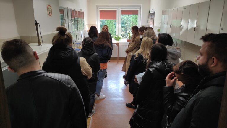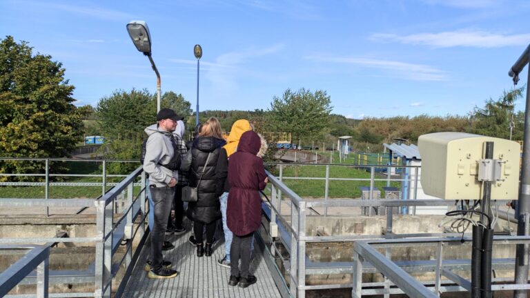 Pani mgr inż. Ewa Grabowska – kierowniczka laboratorium PUW-K – w trakcie oprowadzania po całej infrastrukturze oczyszczalni ścieków, zaprezentowała różne metody oczyszczania wody docierającej z kanalizacji i szamb do oczyszczalni ścieków. Studenci mogli zobaczyć każdy z etapów oczyszczania ścieków, m.in. jak działają komory oczyszczenia, jak wytrąca się osad czy w jaki sposób biologicznie i chemicznie usuwa się np. azot z wody. Studenci, we wcześniej przygotowanym naczyniach, mogli porównać jak wygląda woda docierająca do i wypływająca z oczyszczalni. Niezaprzeczalnie, duże wrażenie wywarła prezentacja pomp o b. wysokiej mocy, które odpowiadają za właściwe przepływ ścieków przez komory oczyszczające.