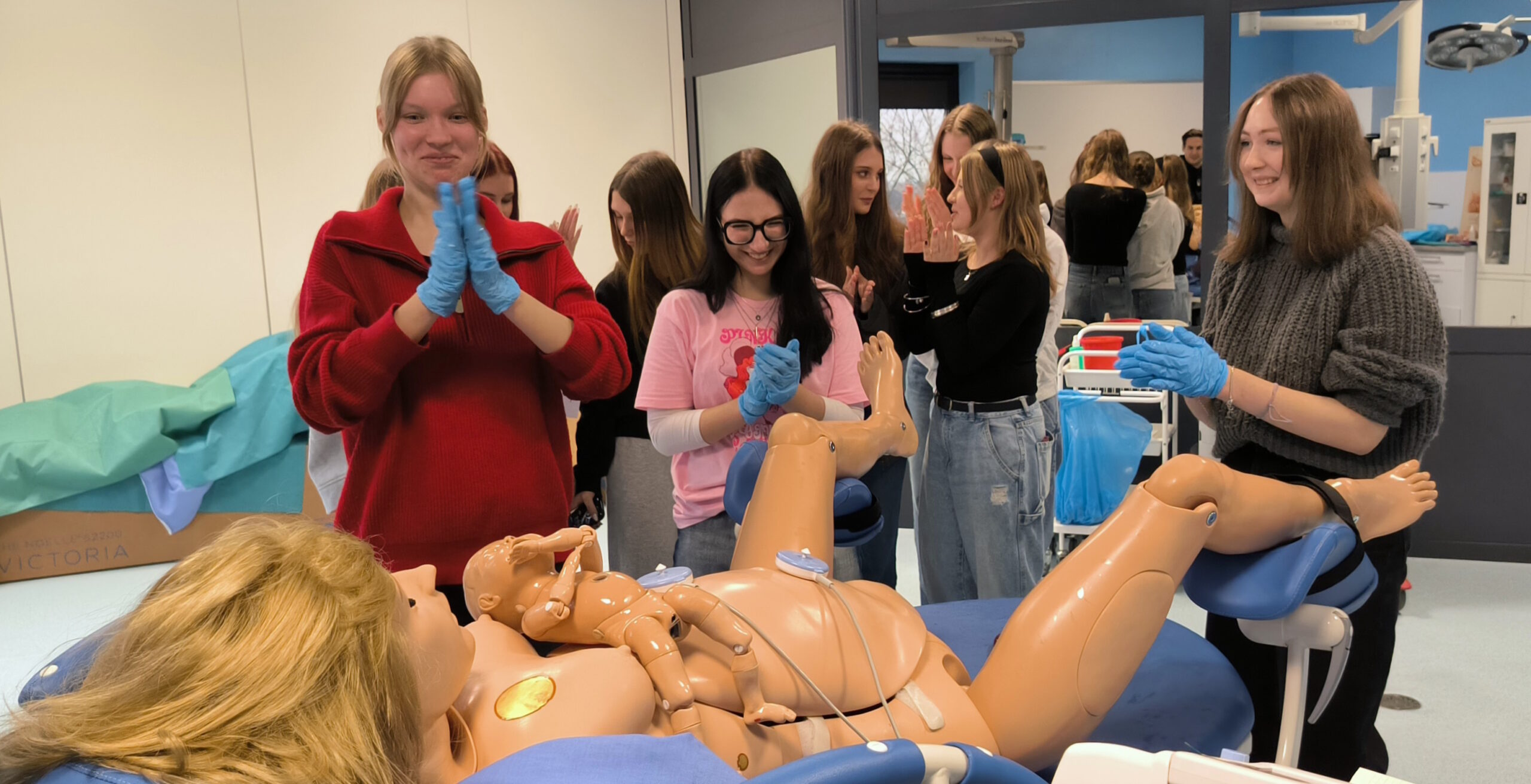 Warsztat z zakresu położnictwa z pokazem symulowanego porodu, prowadzony przez Dawida Domaszewicza i Szymona Wasiaka. Dla wielu uczniów był to najbardziej zaskakujący i angażujący element całej wizyty.