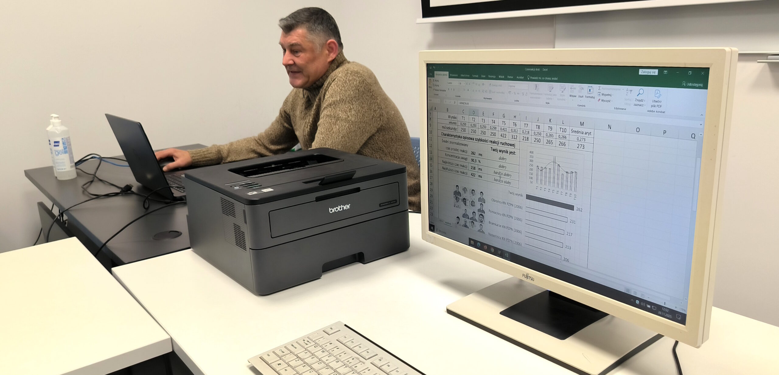 Test szybkości reakcji ruchowej przygotowany przez dr. Roberta Dargiewicza. To dynamiczne stanowisko cieszyło się dużym zainteresowaniem — młodzież mogła sprawdzić swoje refleksy oraz dowiedzieć się, jak tego typu testy wykorzystywane są w diagnostyce i treningu.