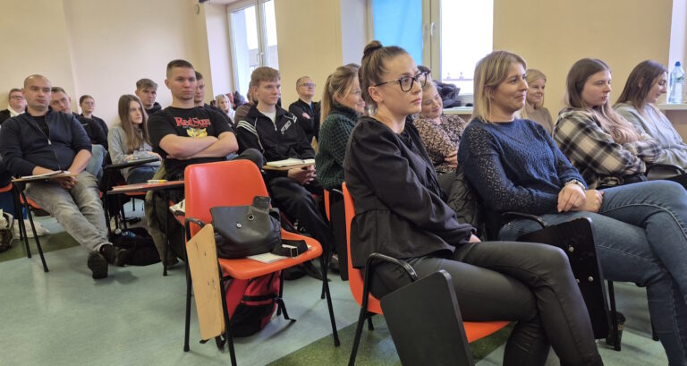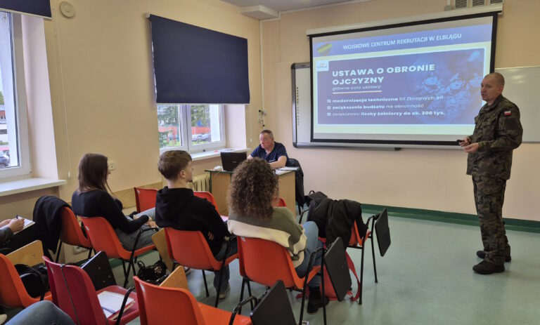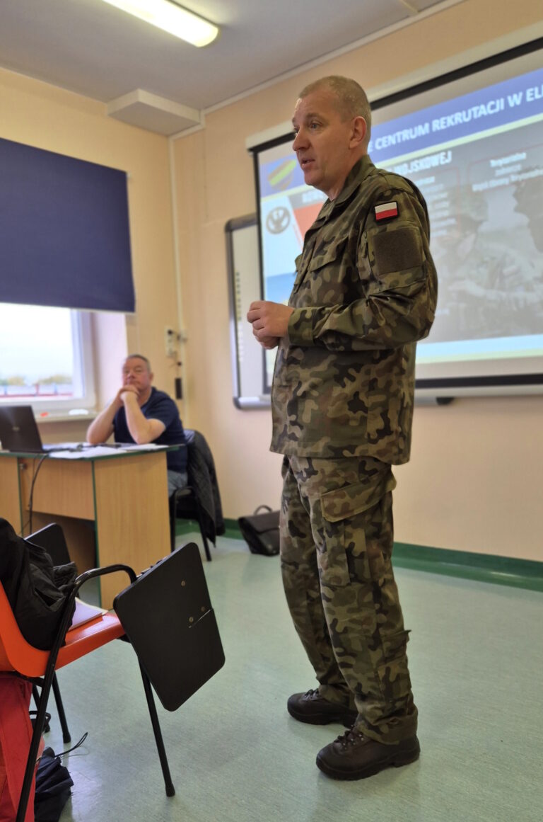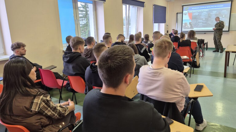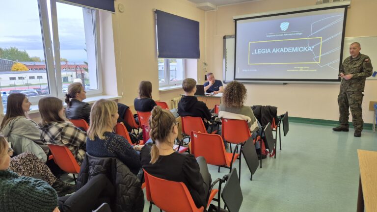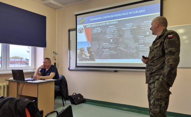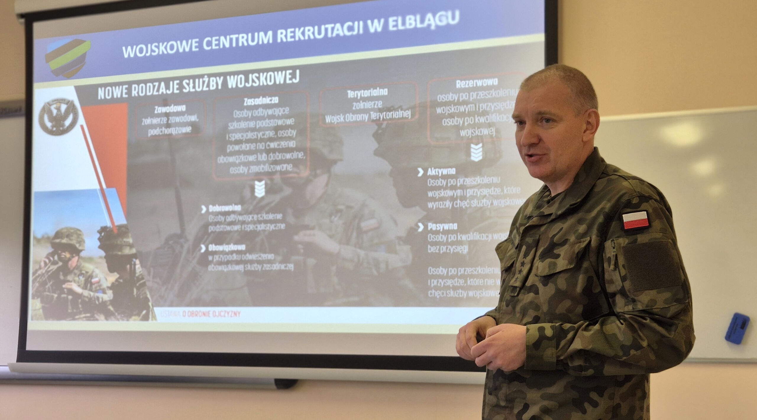 18 października oficer Wojskowego Centrum Rekrutacji w Elblągu, kpt. Mirosław KRUBA spotkał się ze studentami I roku bezpieczeństwa wewnętrznego. Celem spotkania było omówienie i przedstawienie aktualnej struktury organizacyjnej Sił Zbrojnych, zapoznanie z ofertą wojska oraz procedurami i zasadami naboru do poszczególnych rodzajów służby. Spotkanie było dla naszych studentów okazją aby zapytać o zasady i wymagania dotyczące naboru do szkolnictwa wojskowego, zawodowej i dobrowolnej zasadniczej służby wojskowej, terytorialnej służby wojskowej czy aktywnej rezerwy oraz to co najbardziej interesowało naszych studentów – programu Legii Akademickiej o czym także rozmawiał ze słuchaczami kpt. Kruba. Wszystkie informacje na temat służby, kwalifikacji, badań czy wymagań można było uzyskać na miejscu – „u źródła”.
