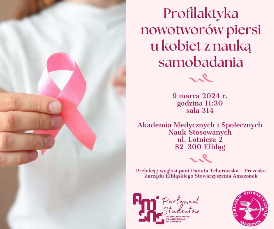 Elbląskie Stowarzyszenie Amazonek i Parlament Studentów AMiSNS zapraszają na prelekcję dotyczącą profilaktyki nowotworów piersi u kobiet z nauką ich samobadania.