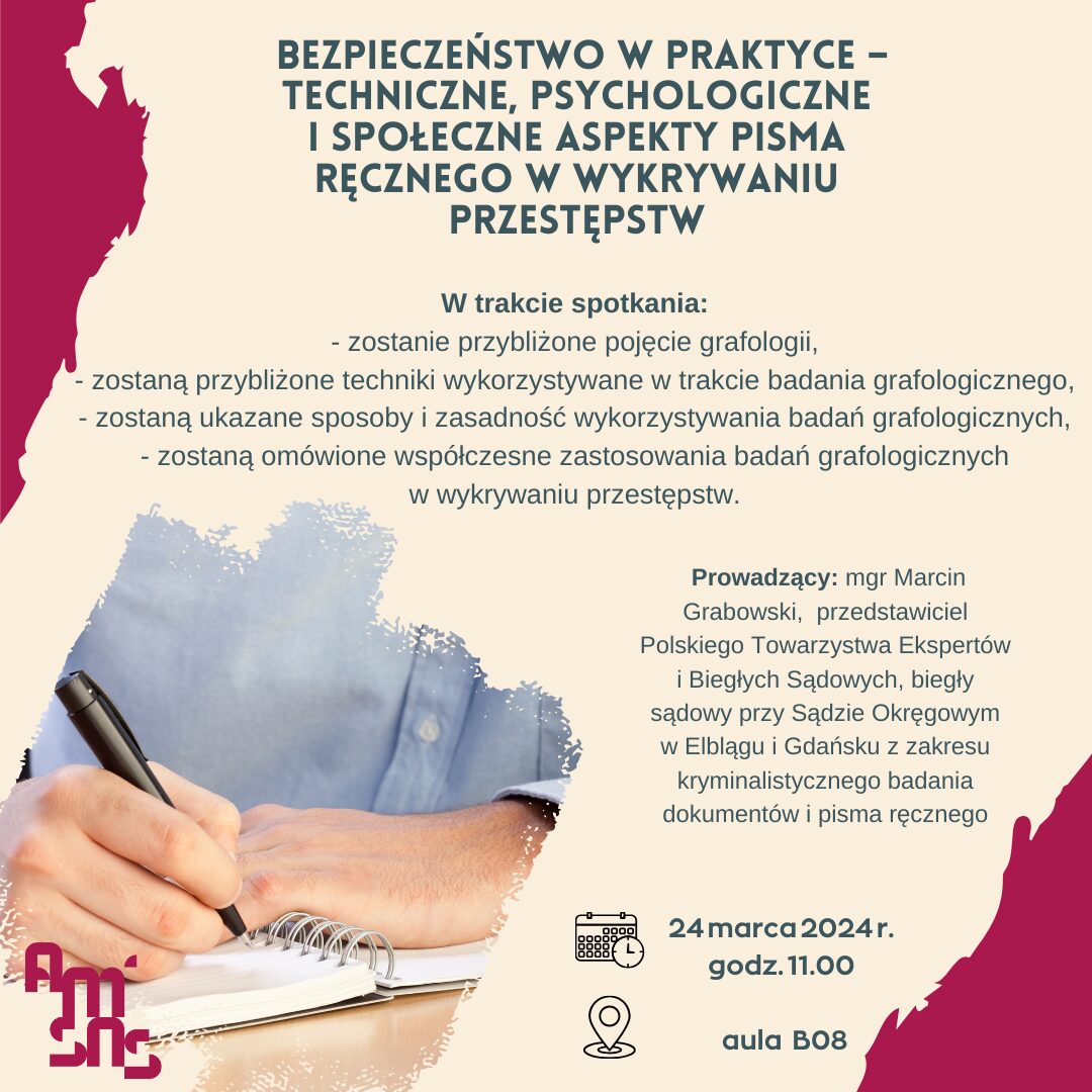 Dziekan Wydziału Administracji i Nauk Społecznych dr Piotr Kulikowski oraz koordynator dr Miłosz Jan Kaczyński zapraszają na spotkanie z praktykiem grafologiem, panem Marcinem Grabowski, pt. „Bezpieczeństwo w praktyce – techniczne, psychologiczne i społeczne aspekty pisma ręcznego w wykrywaniu przestępstw”, które odbędzie się 24 marca 2024 r. o godzinie 11.00 w auli B08.