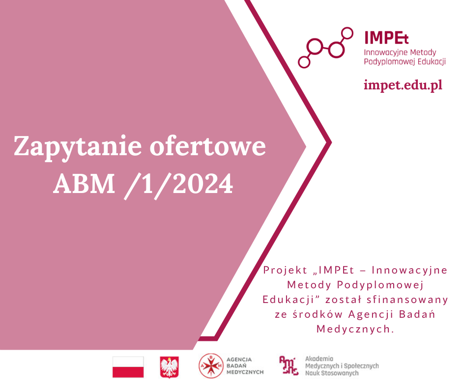 W związku z realizacją projektu pt. „IMPEt – Innowacyjne Metody Podyplomowej Edukacji w Akademii Medycznych i Społecznych Nauk Stosowanych w Elblągu” (nr Umowy: 2023/ABM/06/00008-00), dla którego Uczelnia otrzymała od Agencji Badań Medycznych dofinansowanie ze środków publicznych Budżetu Państwa w ramach konkursu na „Opracowanie i realizację autorskiego programu studiów podyplomowych z zakresu nauk biomedycznych” oraz obowiązkiem dokonywania zakupów w oparciu o najbardziej korzystną ekonomicznie ofertę, z zachowaniem zasad uczciwej konkurencji, efektywności, jawności i przejrzystości, Akademia Medycznych i Społecznych Nauk Stosowanych składa zapytanie ofertowe dotyczące „Zakupu sprzętu i urządzeń niezbędnych do realizacji studiów podyplomowych FIZJO etap I”.
