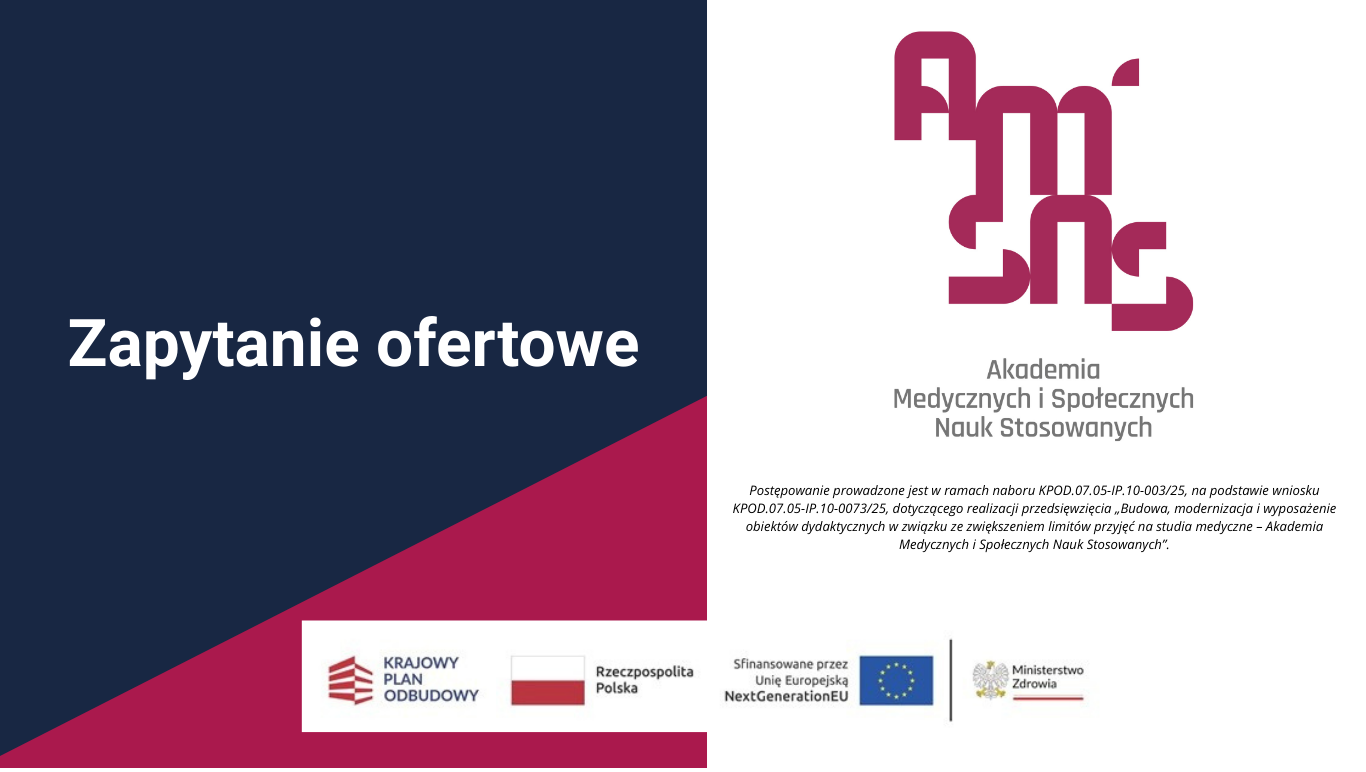 Akademia Medycznych i Społecznych Nauk Stosowanych informuje o ogłoszeniu zapytania ofertowego, prowadzonego zgodnie z zasadą konkurencyjności, dotyczącego wykonania, dostawy oraz montażu dwóch tablic informacyjnych dla przedsięwzięcia realizowanego w ramach Krajowego Planu Odbudowy i Zwiększania Odporności.